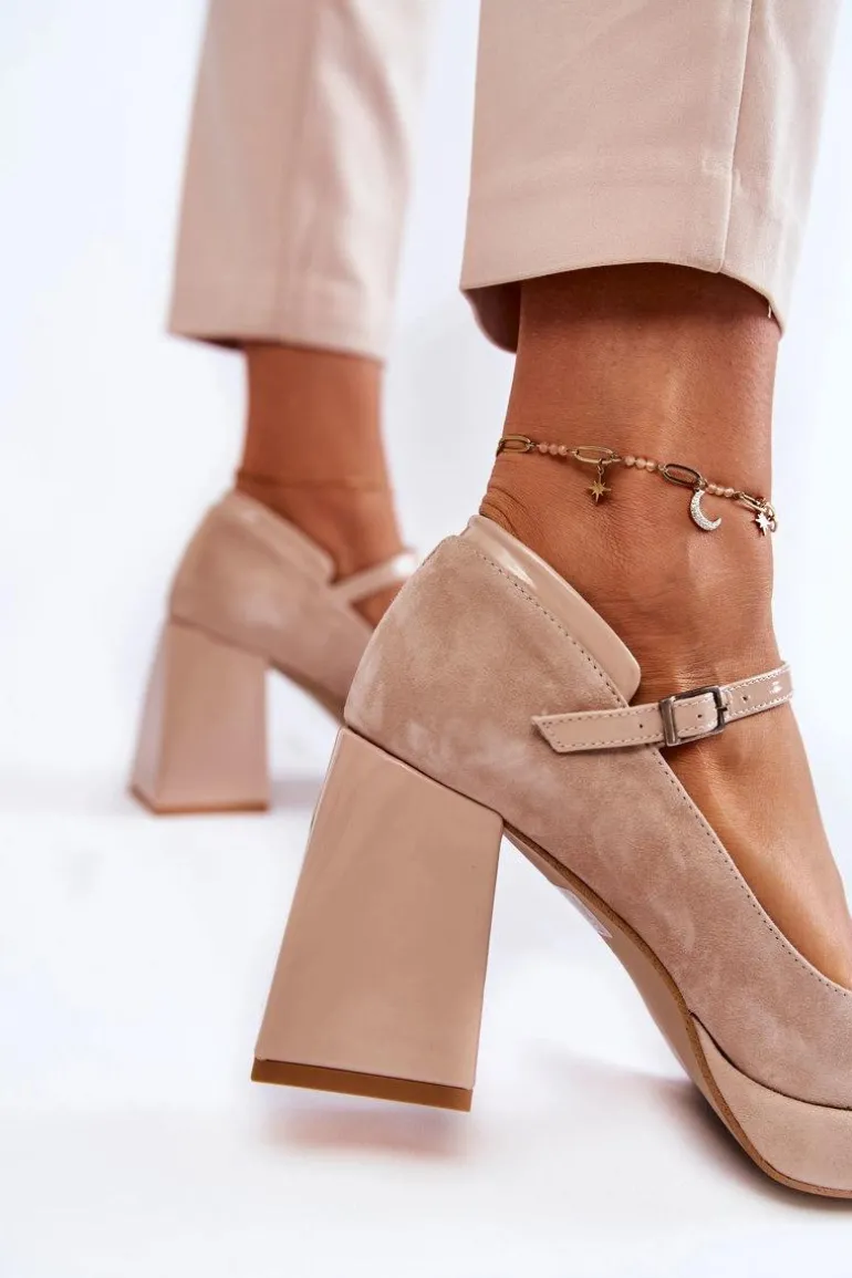 Wyjątkowe czółenka wykonane z wysokiej jakości naturalnej skóry. Posiadają regulowany pasek zapinany na sprzączkę. Osadzone na masywnym, wyższym obcasie w postaci klocka. Zapiętek jest usztywniany, a nosek kwadratowy. Miękka wkładka zapewnia wygodę podczas użytkowania. Dodatkowo buty posiadają delikatną platformę. Świetny model na różnego rodzaju uroczystości. Przy wyborze rozmiaru prosimy sugerować się tabelą rozmiarów.