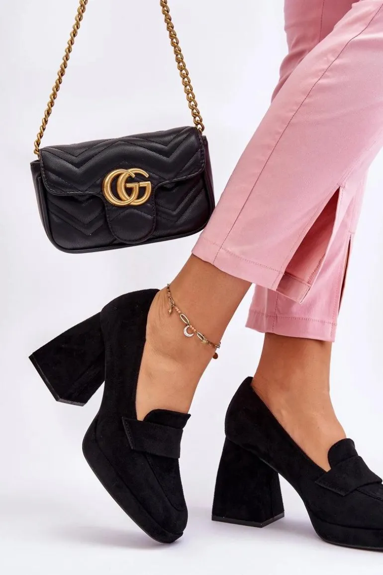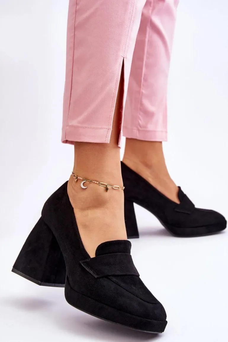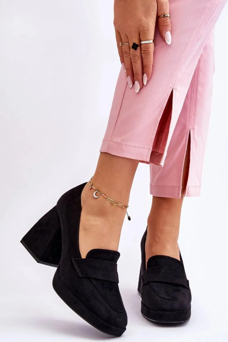 Wyjątkowe, damskie czółenka wykonane z eko zamszu. Posiadają z przodu paseczek z tego samego materiału. Osadzone na masywnym obcasie w postaci klocka oraz platformie. Te cudowne czółenka z pewnością przypadną Ci do gustu. Miękka, eko skórzana wkładka zapewni komfortowe użytkowanie. Przy wyborze rozmiaru prosimy sugerować się tabelą rozmiarów.