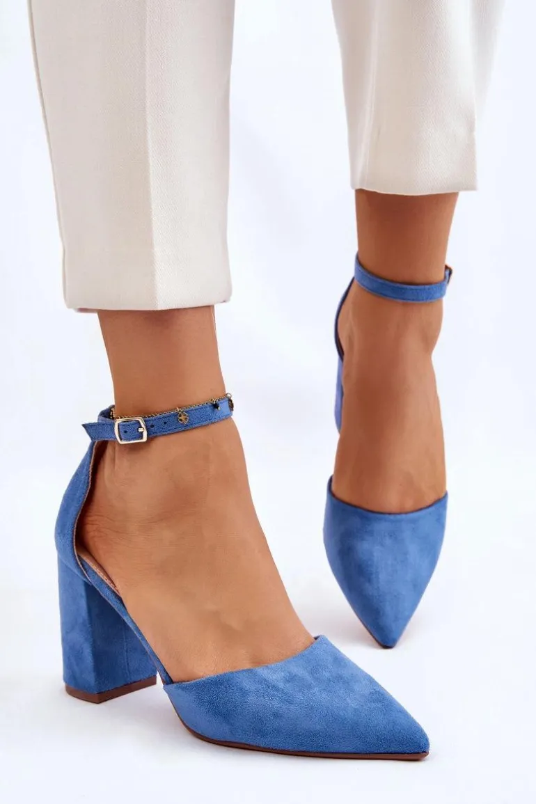 Klasyczne czółenka z noskiem w szpic zostały wykonane z eko zamszu. Zapinane wokół kostki na sprzączkę z regulowanym paskiem. Miękka wkładka z eko skóry zapewnia wysoki komfort użytkowania. Czółenka zostały osadzone na obcasie w postaci słupka. Świetnie sprawdzą się w zestawieniu z sukienkami, eleganckimi spodniami czy jeansami. Przy wyborze rozmiaru prosimy kierować się tabelą rozmiarów