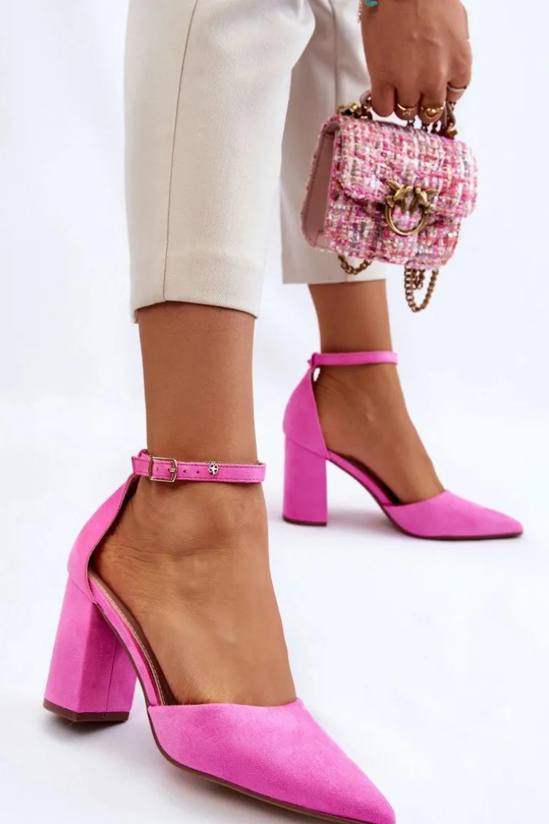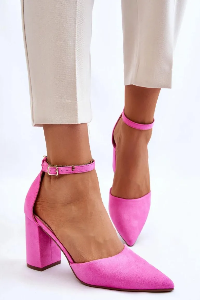 Klasyczne czółenka z noskiem w szpic zostały wykonane z eko zamszu. Zapinane wokół kostki na sprzączkę z regulowanym paskiem. Miękka wkładka z eko skóry zapewnia wysoki komfort użytkowania. Czółenka zostały osadzone na obcasie w postaci słupka. Świetnie sprawdzą się w zestawieniu z sukienkami, eleganckimi spodniami czy jeansami. Przy wyborze rozmiaru prosimy kierować się tabelą rozmiarów