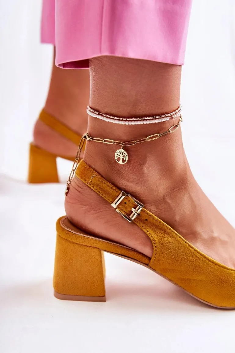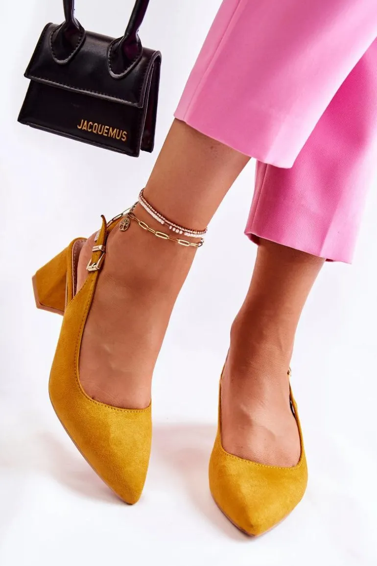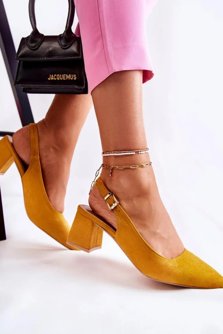 Cudne czółenka z odkrytą piętą i zakrytym noskiem w szpic. Wykonane z przyjemnego w dotyku, eko zamszu. Posiadają regulowany pasek zapinany na sprzączkę. Osadzone na obcasie w postaci klocka, który zapewni stabilność na każdym kroku. Miękka, wykonana z eko skóry wkładka to gwarancja komfortu podczas użytkowania. Czółenka te świetnie sprawdzą się podczas spotkań biznesowych czy uroczystości rodzinnych. Przy wyborze rozmiaru prosimy kierować się tabelą rozmiarów