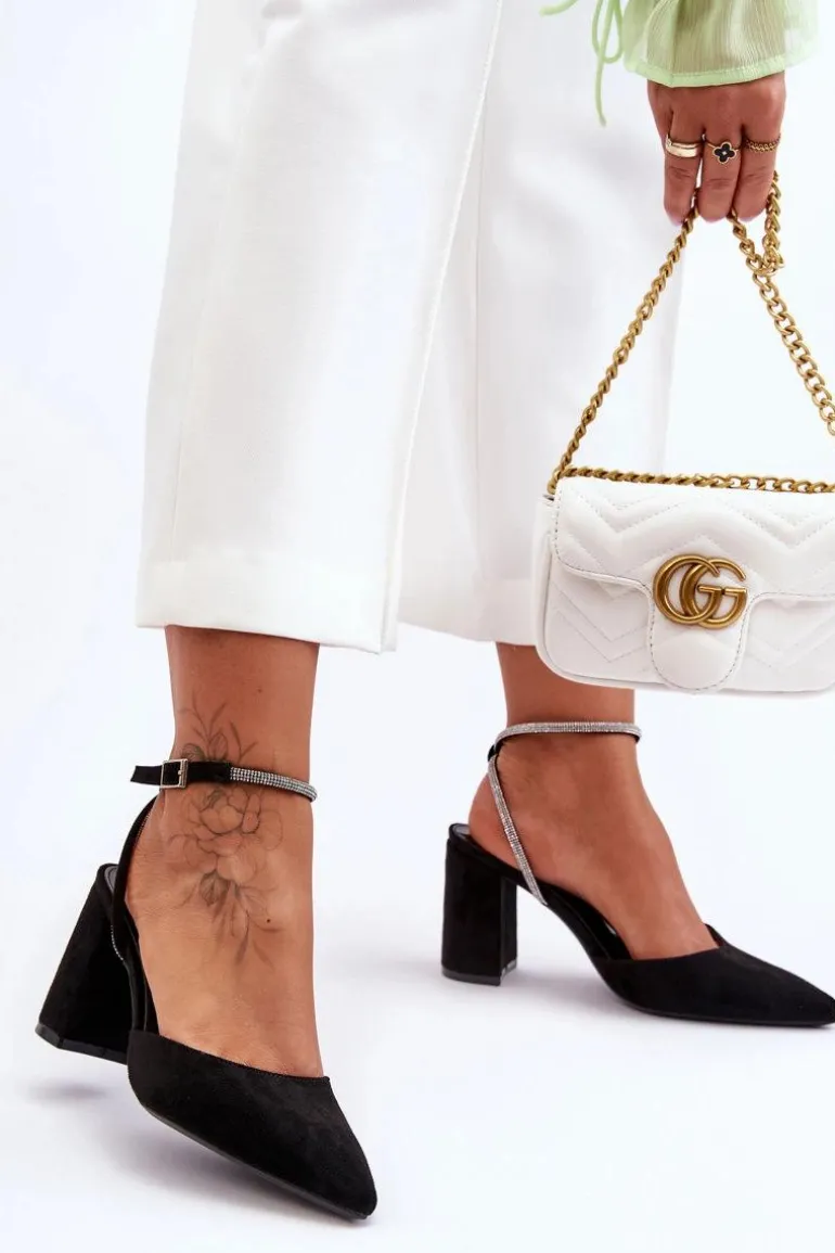 Eleganckie czółenka zostały wykonane z eko zamszu. Osadzono je na obcasie w postaci stabilnego słupka. Miękka, eko skórzana wkładka zapewni komfortowe użytkowanie. Charakterystyczny nosek w szpic oraz zdobiony dżetami imitującymi cyrkonie pasek wyróżnia ten model na tle innych. Czółenka posiadają zapięcie na sprzączkę. Ten model z pewnością wykorzystasz na wiele okazji! Przy wyborze rozmiaru prosimy sugerować się tabelą rozmiarów.