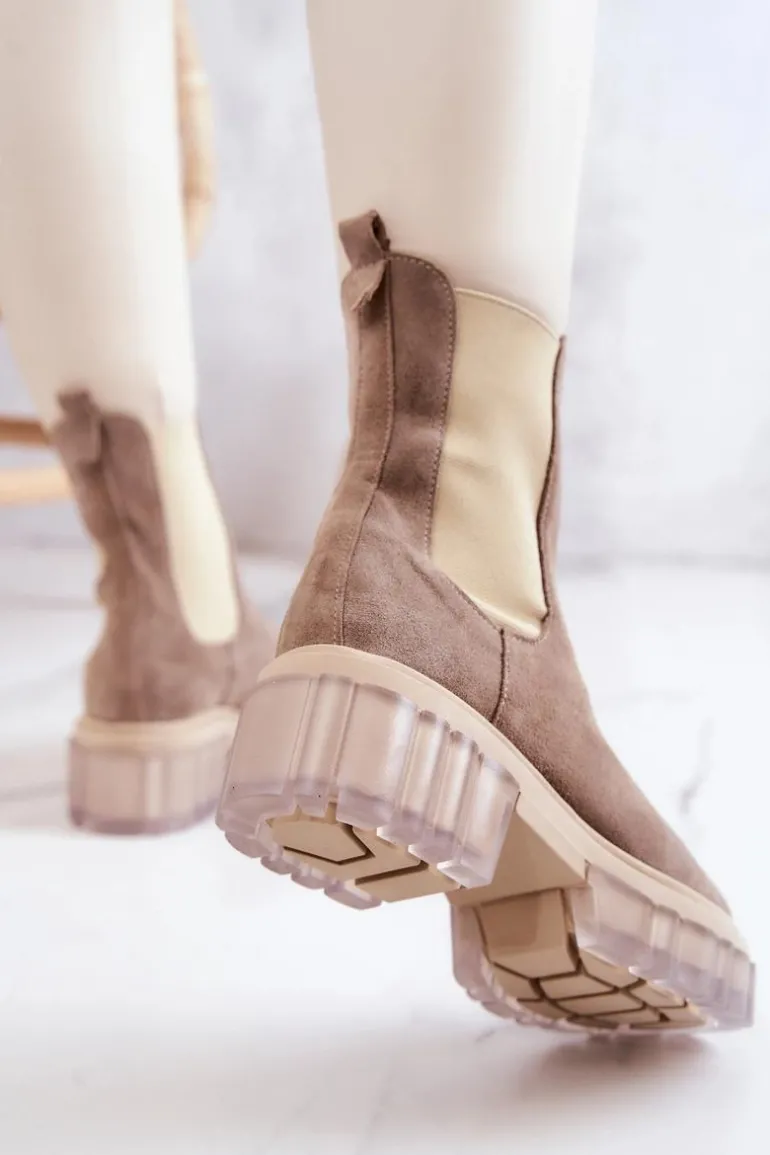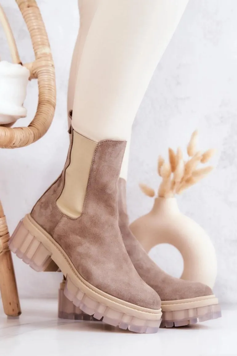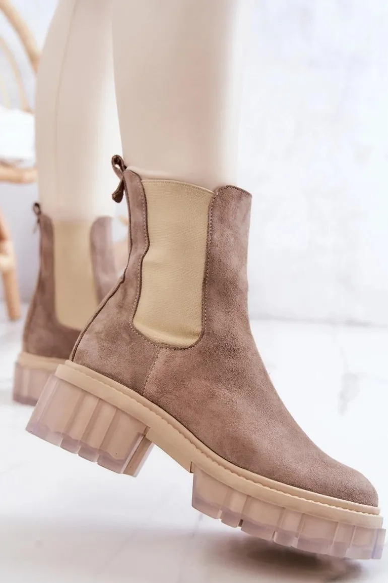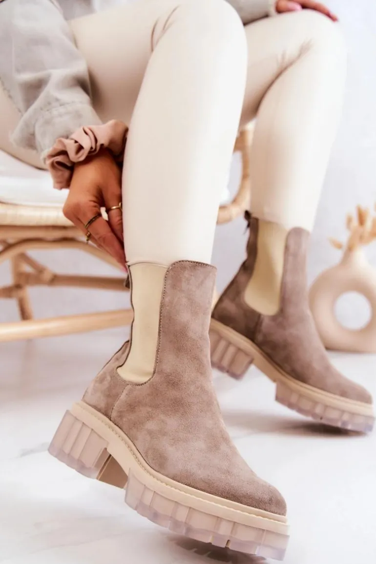 Botki na masywnej platformie z szerokim obcasem w stylu sztybletów. Posiadają wysoką, sięgającą ponad kostkę cholewkę. Wykonane z naturalnej zamszowej skóry. Posiadają dodatkową, elastyczną wstawkę, dzięki której cholewka świetnie dopasuje się do tęgości nogi. Boki podeszwy są ozdobione przezroczystym, gumowym tworzywem. Przy wyborze rozmiaru prosimy kierować się tabelą rozmiarów