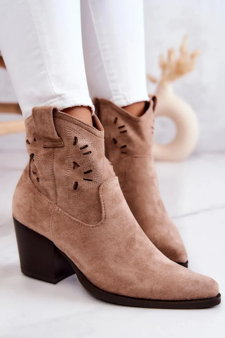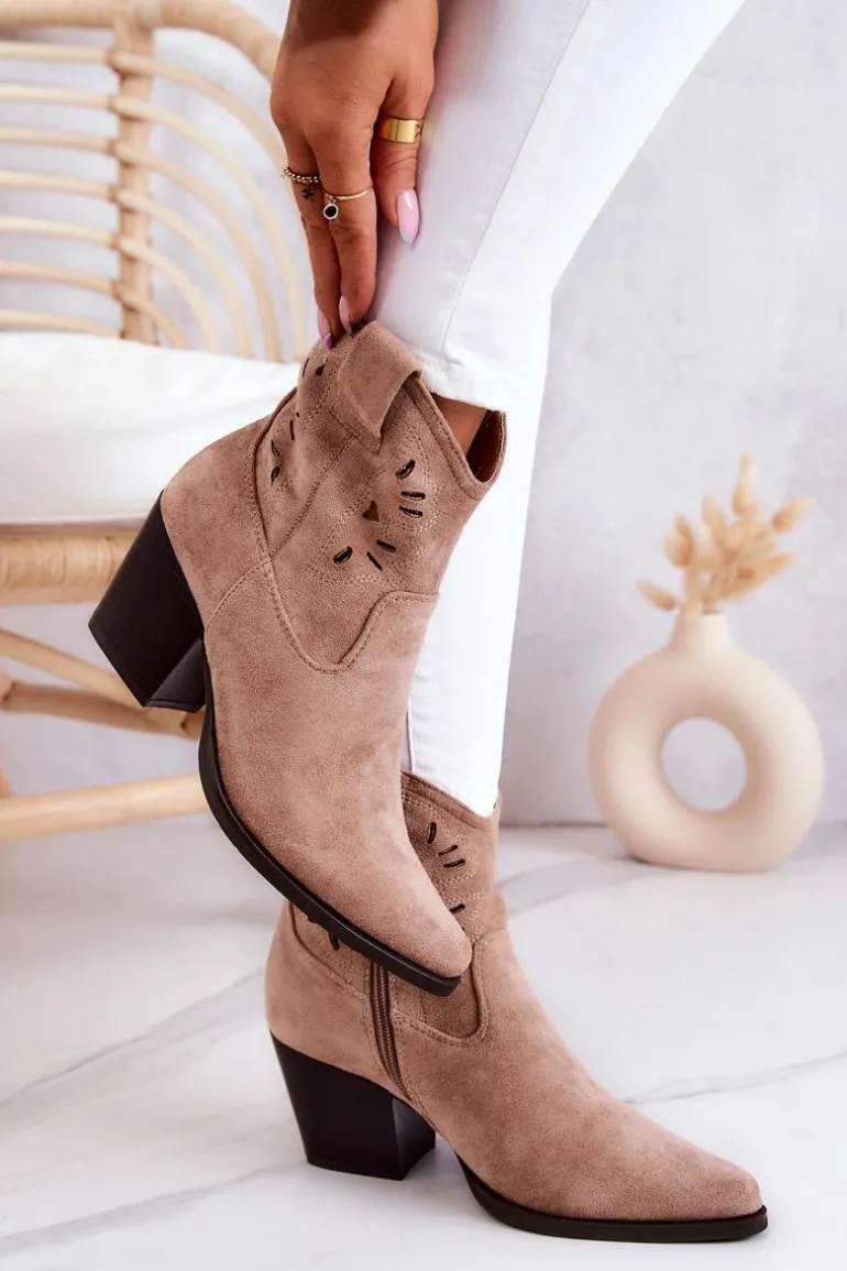 Kowbojki na masywnym słupku posiadają u góry zaokrągloną cholewką i nosek w szpic. Zapinane na zamek błyskawiczny. Usztywniany zapiętek. Wykonane z eko zamszu. Botki typu kowbojki będą świetnym uzupełnieniem wielu stylizacji. Możesz nosić je w wielu stylizacjach m.in.: do szmizjerek, zwiewnych spódnic czy spodni jeansowych. Przy wyborze rozmiaru prosimy sugerować się tabelą rozmiarów.