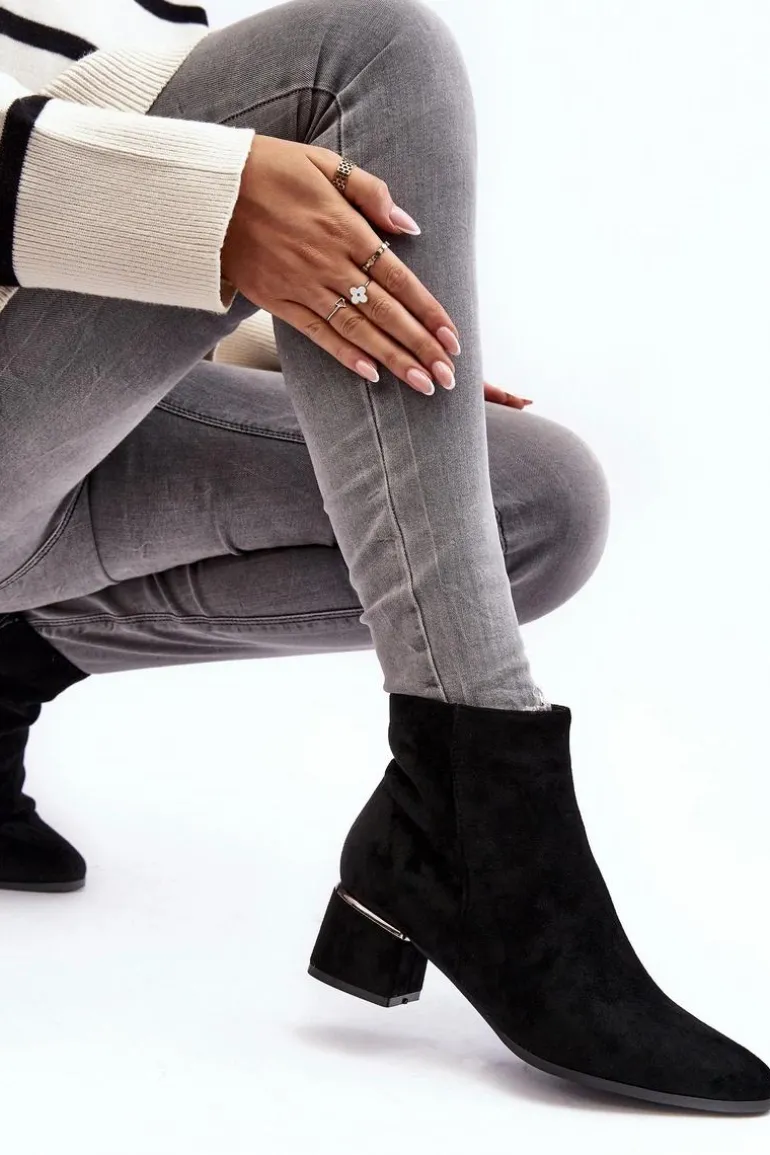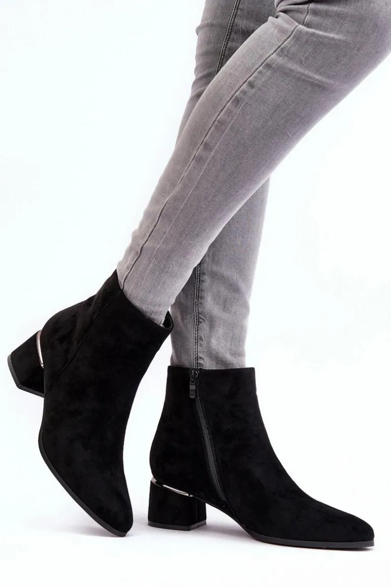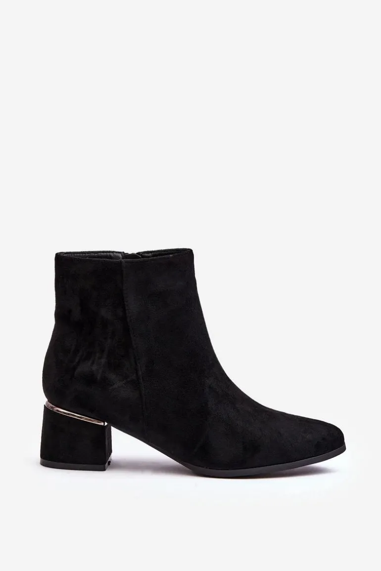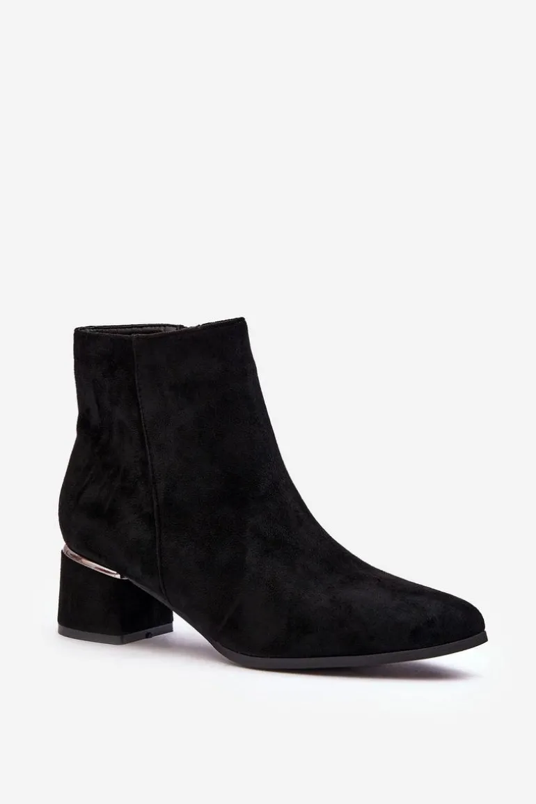 Damskie botki wykonane z eko zamszu. Osadzone na obcasie w postaci niskiego klocka. Noski w migdał. Cholewka za kostkę. Środek ocieplony kocem obuwniczym. Model ten zapinany jest na suwak z boku. Nad obcasem lustrzana, złota ozdoba. Przy wyborze rozmiaru prosimy sugerować się tabelą rozmiarów.