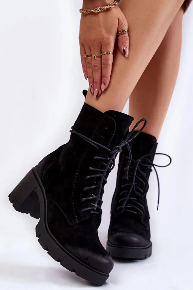 Damskie botki osadzono na masywnej platformie z szerokim obcasem w postaci słupka. Posiadają wysoką, sięgającą ponad kostkę cholewkę. Wykonane z naturalnych skór wysokiej jakości. Buty zostały ocieplone kocem obuwniczym. Model z solidnym sznurowaniem. Dodatkowo zamykane na suwak. Botki doskonale sprawdzą się w jesiennych stylizacjach. Przy wyborze rozmiaru prosimy kierować się tabelą rozmiarów