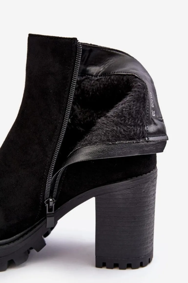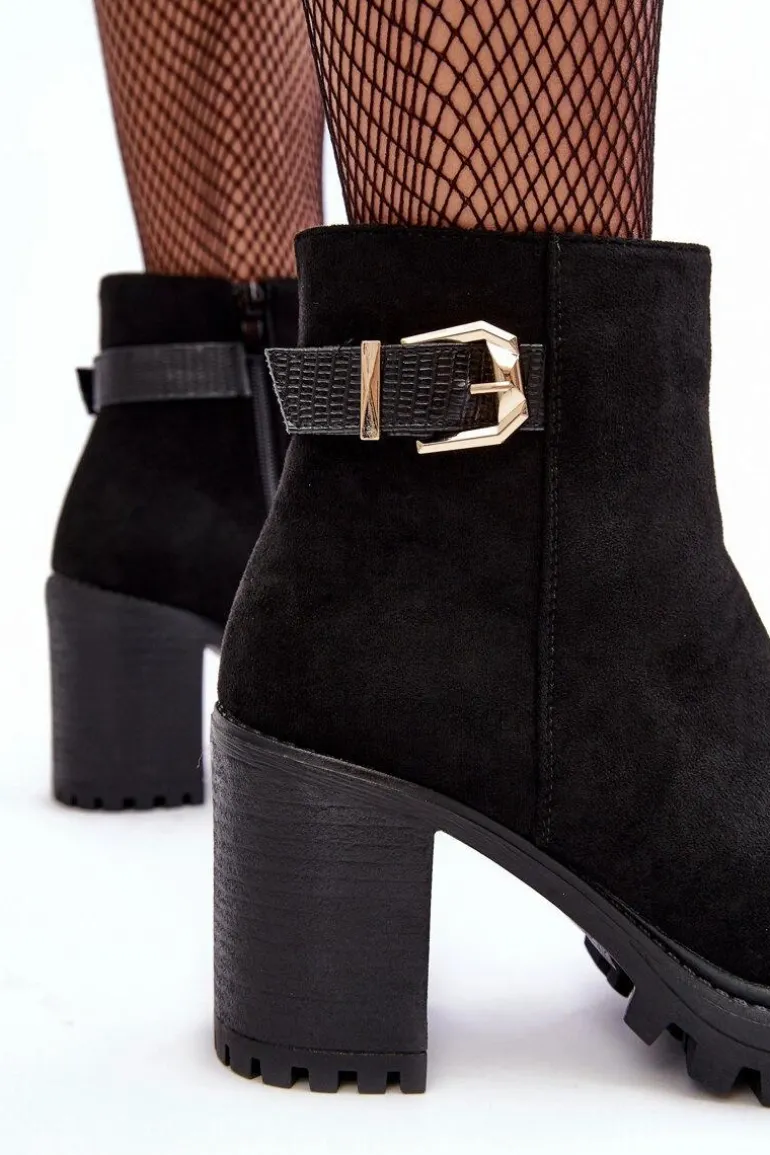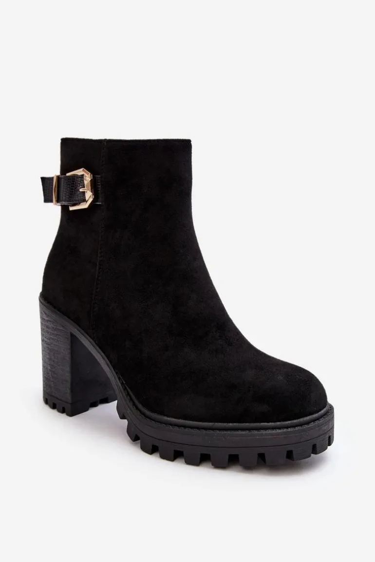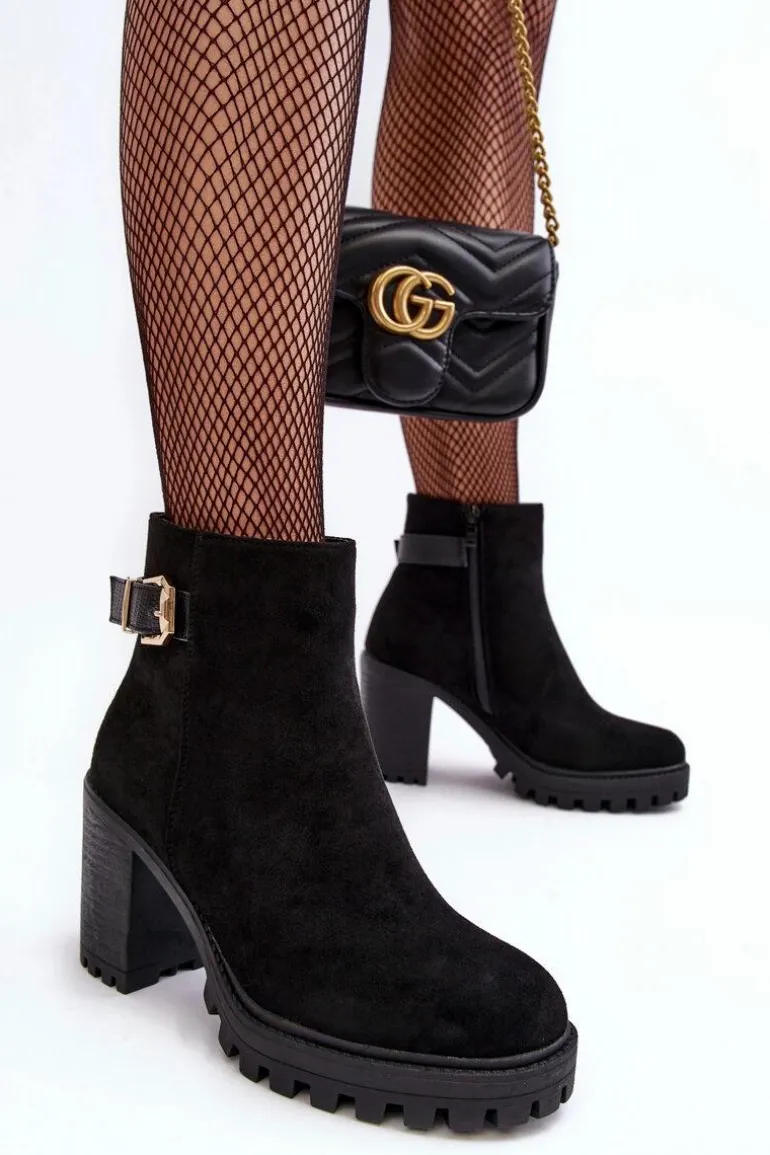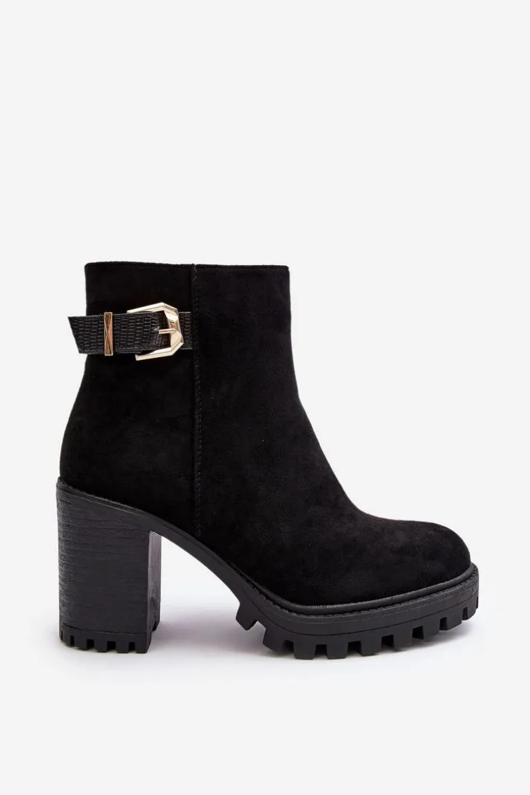 Botki damskie osadzone na obcasie w postaci słupka oraz platformie. Wykonane z eko zamszu. Na cholewce pasek ze złotą klamrą. Środek ocieplony kocem obuwniczym. Noski zaokrąglone. Usztywniony zapiętek. Model ten będzie idealnym uzupełnieniem jesienno-zimowych stylizacji! Przy wyborze rozmiaru prosimy sugerować się tabelą rozmiarów.