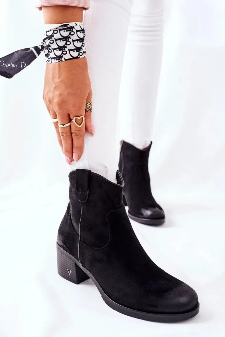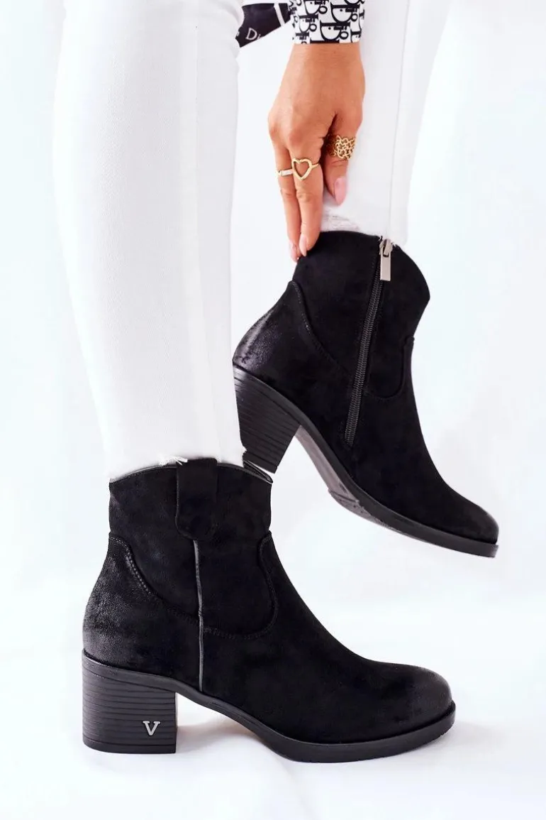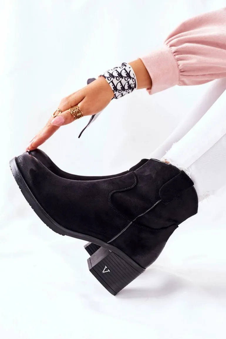 Cholewka wykonana jest z zamszowej skóry ekologicznej. Wnętrze botków pokryte zostało ciepłym kocem obuwniczym, który zagwarantuje ciepło. Zakładanie ułatwi wszyty z tyłu suwak. Przy wyborze rozmiaru prosimy sugerować się tabelą rozmiarów.