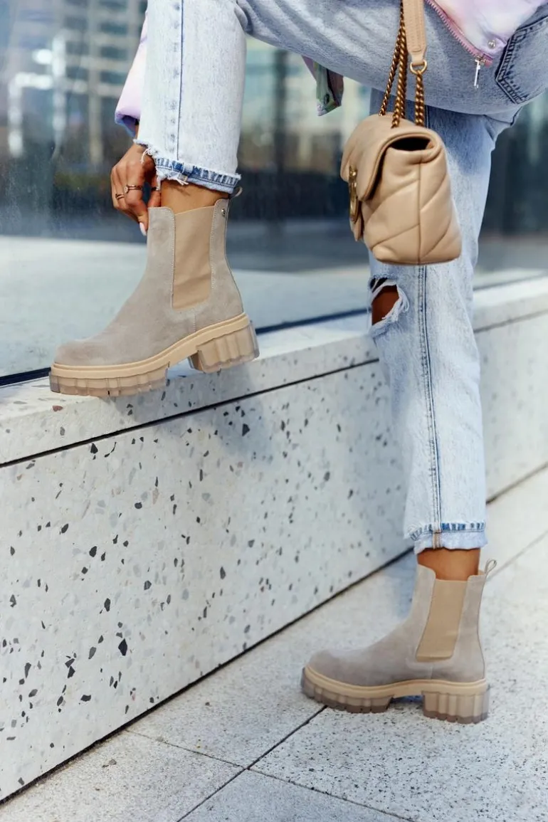 Botki na masywnej platformie z szerokim obcasem w stylu sztybletów. Posiadają wysoką, sięgającą ponad kostkę cholewkę. Wykonane z naturalnej zamszowej skóry. Posiadają dodatkową, elastyczną wstawkę, dzięki której cholewka świetnie dopasuje się do tęgości nogi. Boki podeszwy są ozdobione przezroczystym, gumowym tworzywem. Przy wyborze rozmiaru prosimy kierować się tabelą rozmiarów