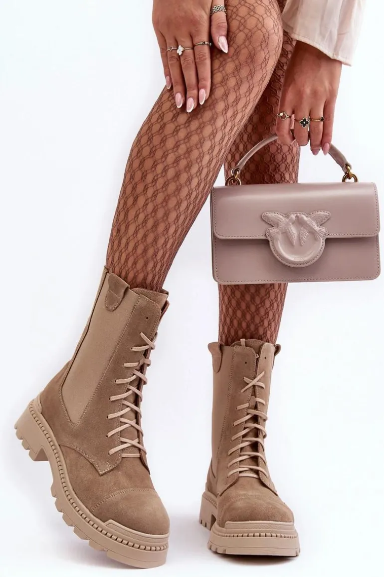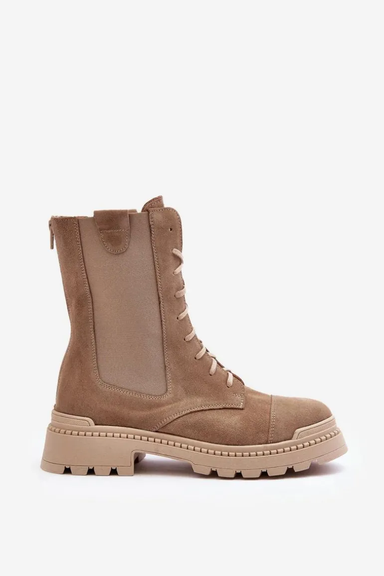 Workery damskie wykonane ze skóry naturalnej zamszowej. Osadzone na płaskim obcasie i platformie. Na cholewce elastyczne wstawki oraz suwak z tyłu. Noski zaokrąglone. Skórzana wkładka zapewni komfortowe użytkowanie obuwia. Przy wyborze rozmiaru prosimy sugerować się tabelą rozmiarów.