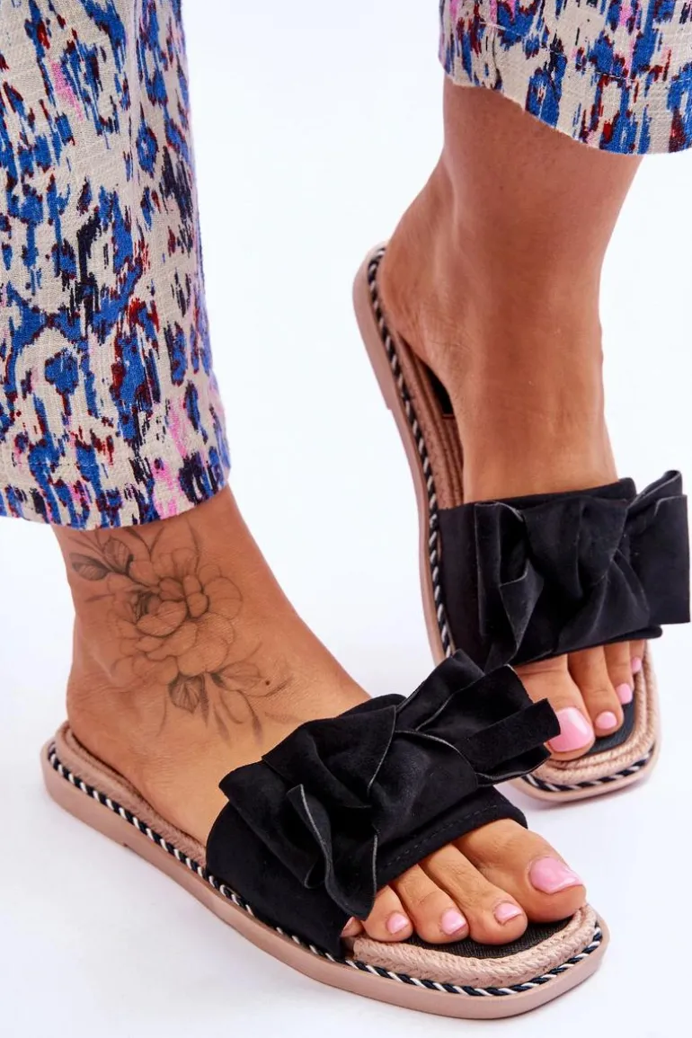 Klasyczne, wsuwane klapki damskie zostały wykonane z wierzchu z eko zamszu. Dodatkowo z przodu posiadają kokardę. Wkładka oraz podeszwa zostały wykonane z gumowego tworzywa. Klapki są wygodne w użytkowaniu oraz elastyczne. Podeszwa jest także antypoślizgowa. Wokół podeszwy znajduje się ozdobny sznurek. Klapki osadzono na płaskim obcasie. Przy wyborze rozmiaru prosimy sugerować się tabelą rozmiarów.