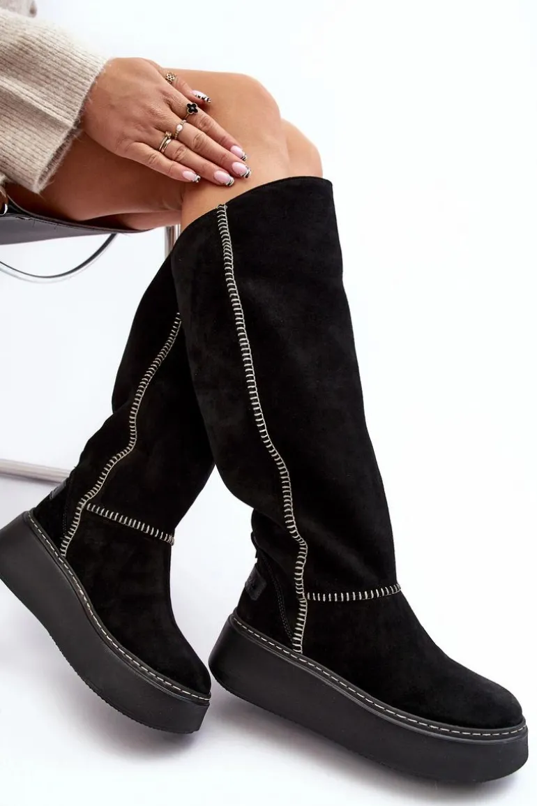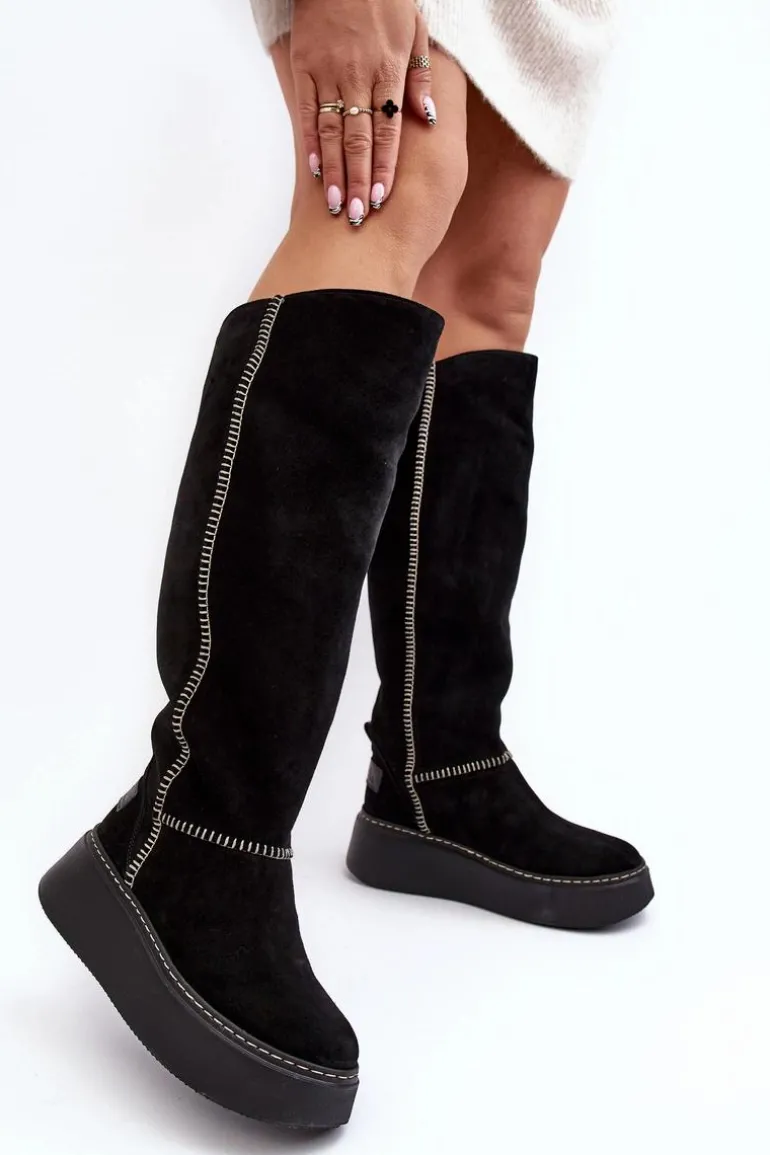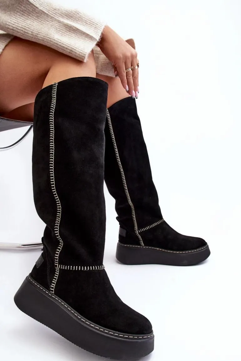 Damskie kozaki od marki Maciejka. Wykonane z naturalnego zamszu. Osadzone na masywnej platformie, która świetnie odizoluje od zimnego podłoża. Środek ocieplony kożuszkiem. Model wsuwany z cholewką przed kolano. Noski zaokrąglone. Kozaki dopełnią każdą Twoją stylizację. Koniecznie sprawdź całą naszą ofertę butów Maciejka! Przy wyborze rozmiaru prosimy sugerować się tabelą rozmiarów.