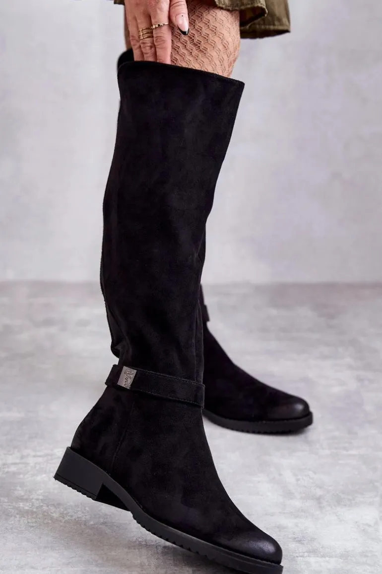Klasyczne, damskie kozaki zostały wykonane z eko skórzanych materiałów z dbałością o szczegóły. Model ten posiada suwak na całej długości cholewki. Kozaki osadzono na płaskim obcasie. Nie posiadają ocieplenia. Dodatkowo zapiętek jest usztywniany. Cholewka przyozdobiona paskiem z metalową blaszką. Cholewka u góry posiada nieregularne zakończenie. Przy wyborze rozmiaru prosimy sugerować się tabelą rozmiarów.