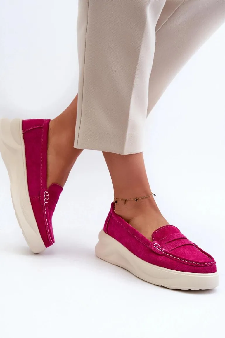 Mokasyny damskie wykonane z naturalnego zamszu. Osadzone na platformie i lekkim koturnie. Noski zaokrąglone. Idealne do wielu stylizacji, te mokasyny to połączenie elegancji i komfortu. Koniecznie powinnaś je mieć w swojej garderobie! Przy wyborze rozmiaru prosimy sugerować się tabelą rozmiarów.