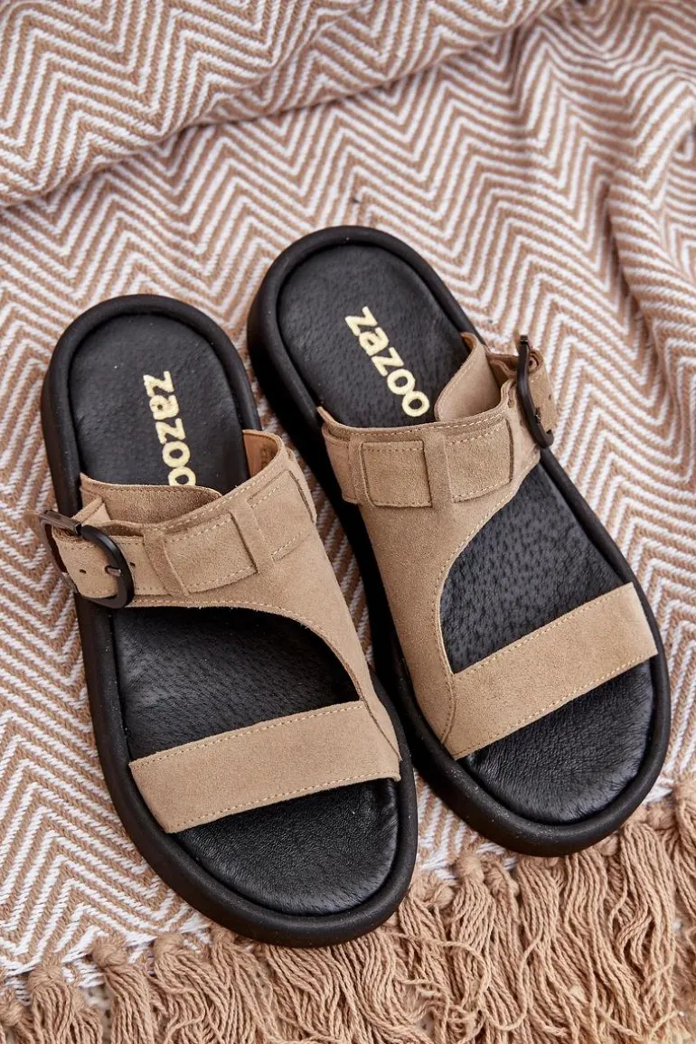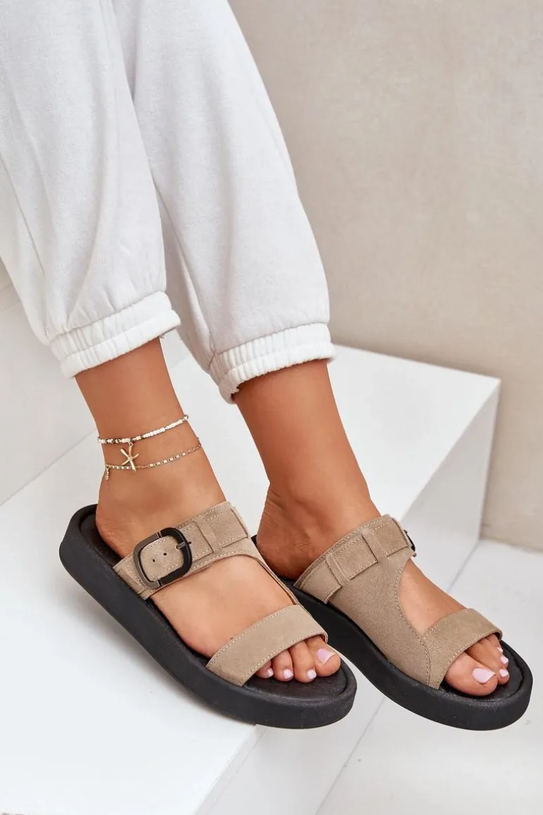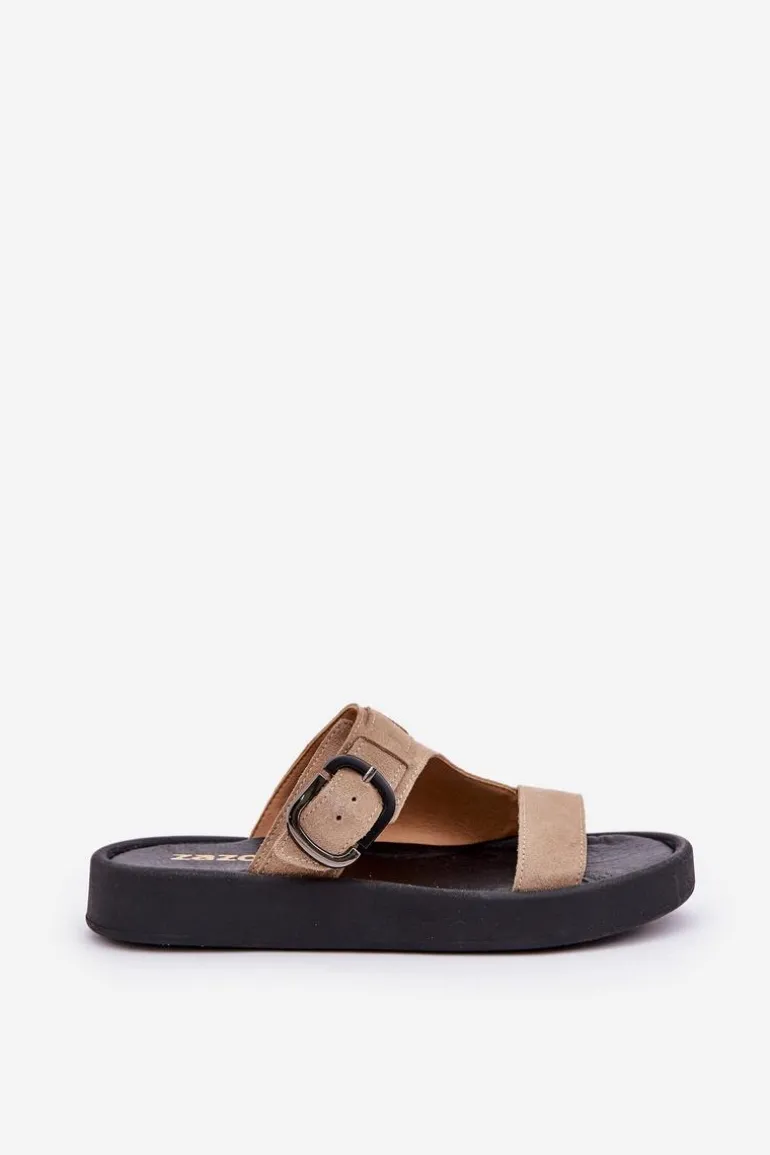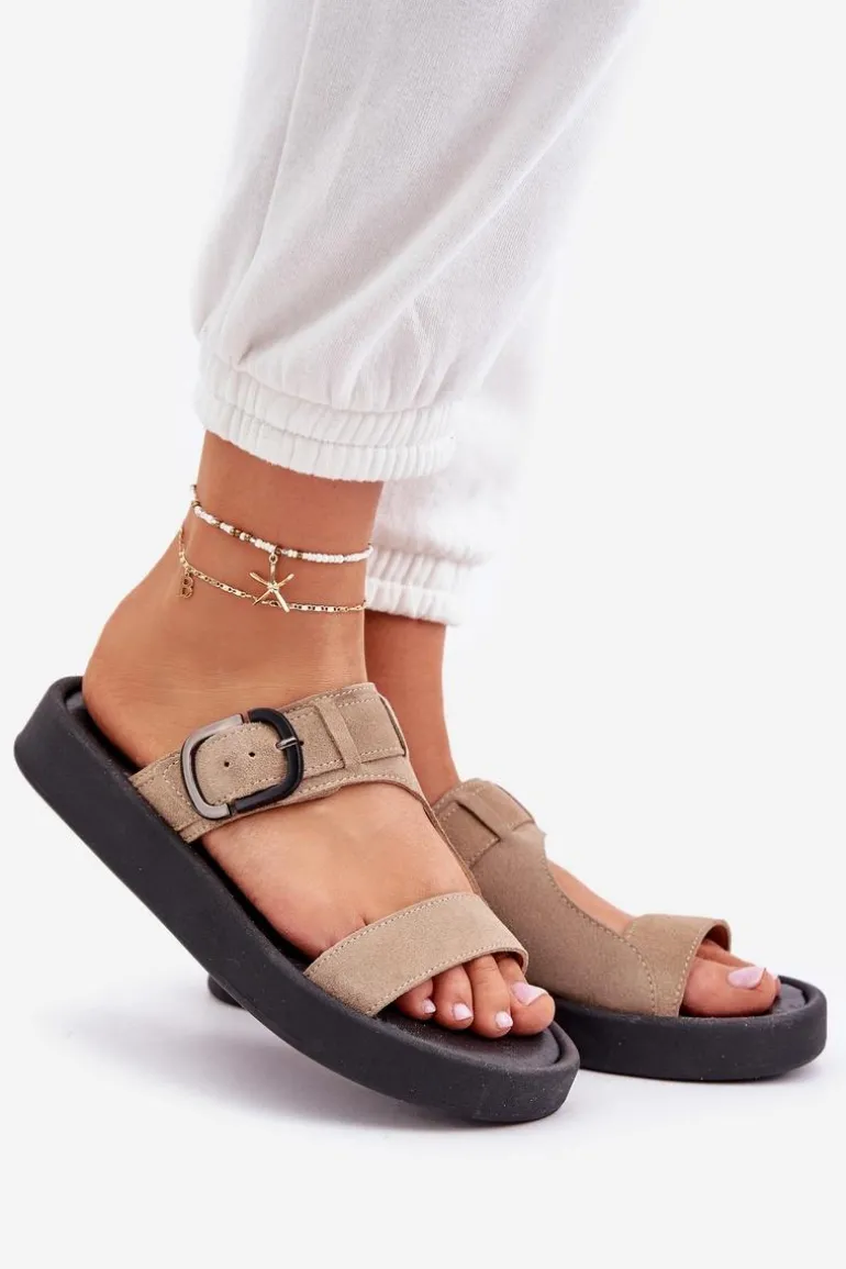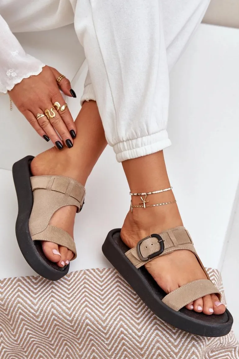 Damskie klapki wykonane z naturalnego zamszu. Osadzone na platformie. Doskonałe na letnie dni, te klapki znakomicie uzupełnią każdą stylizację, łącząc modny wygląd z praktycznością. Pasek z klamrą zapewnia dodatkową regulację, a miękka wkładka skórzana gwarantuje komfort noszenia. Przy wyborze rozmiaru prosimy sugerować się tabelą rozmiarów.