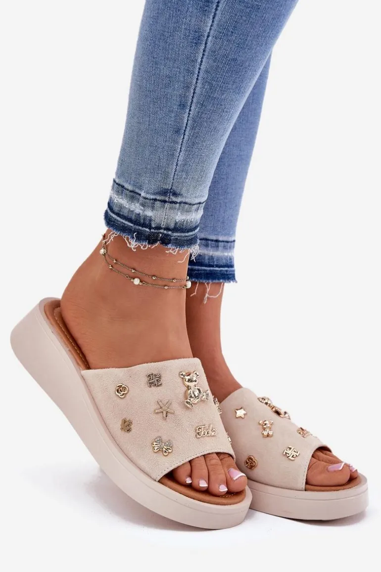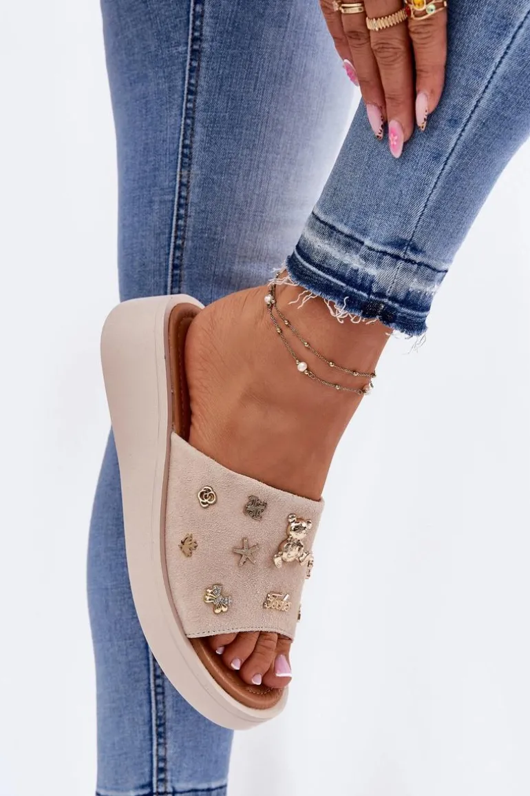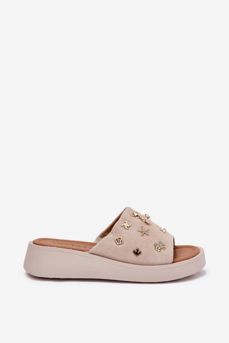 Klapki damskie od marki Vinceza to elegancka i stylowa propozycja na ciepłe dni. Wykonane z naturalnego zamszu, gwarantują wysoką jakość i komfort noszenia. Model osadzony na platformie zapewnia stabilność i wygodę, jednocześnie dodając lekkości całej stylizacji. Klapki wyróżniają się modnymi przypinkami na pasku, które stanowią ciekawy akcent i nadają obuwiu wyjątkowego charakteru. To doskonały wybór dla kobiet szukających połączenia klasyki z nowoczesnym wyglądem. Przy wyborze rozmiaru prosimy sugerować się tabelą rozmiarów.