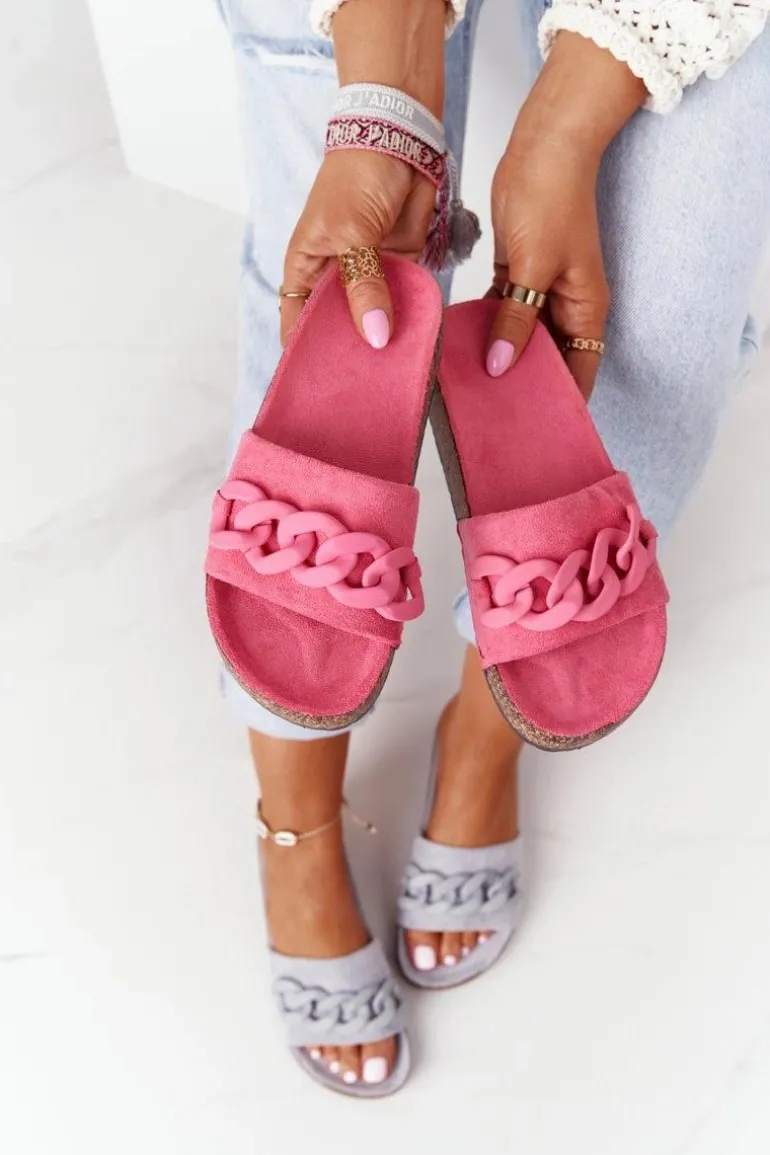 Wyjątkowe klapki damskie wykonane z eko zamszu. Buty posiadają profilowaną wkładkę, która zagwarantuje komfort. Modny fason ozdobiony lekkim łańcuchem urozmaici Twoje stylizacje! Przy wyborze rozmiaru prosimy sugerować się tabelą rozmiarów.