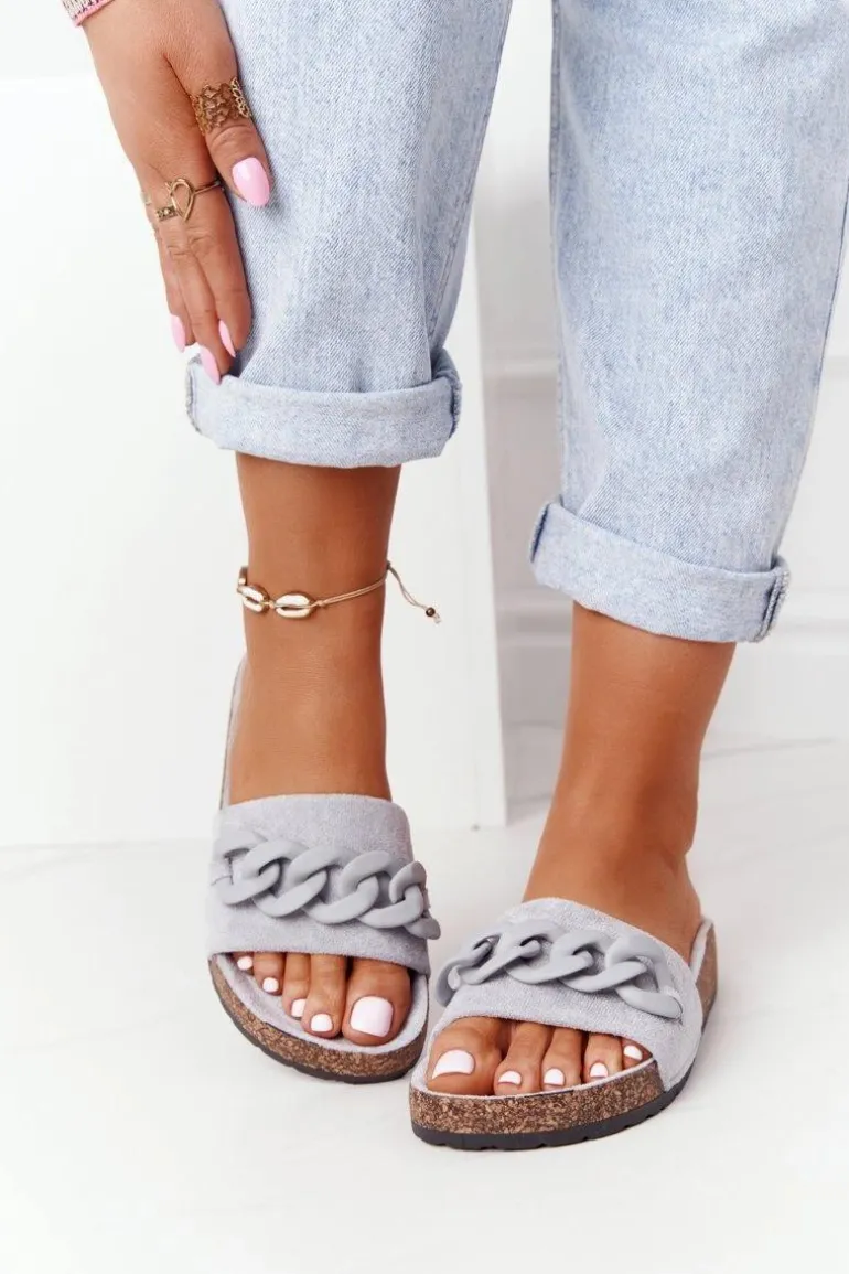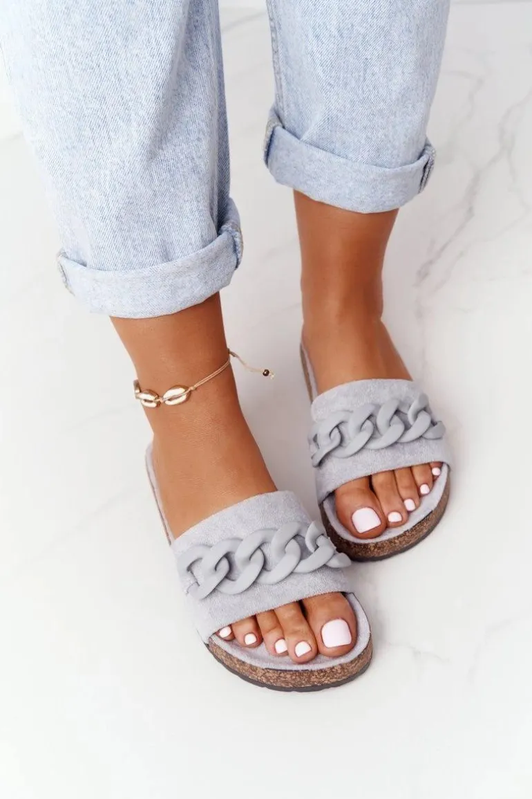 Wyjątkowe klapki damskie wykonane z eko zamszu. Buty posiadają profilowaną wkładkę, która zagwarantuje komfort. Modny fason ozdobiony lekkim łańcuchem urozmaici Twoje stylizacje! Przy wyborze rozmiaru prosimy sugerować się tabelą rozmiarów.