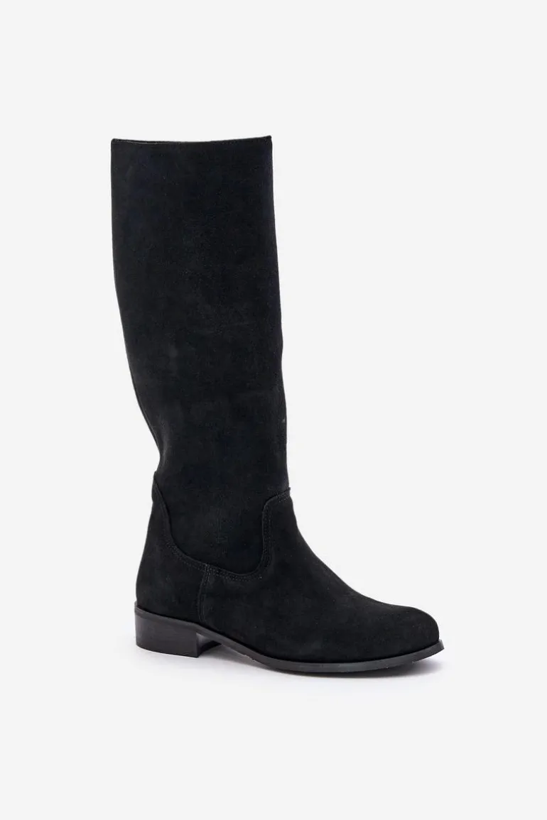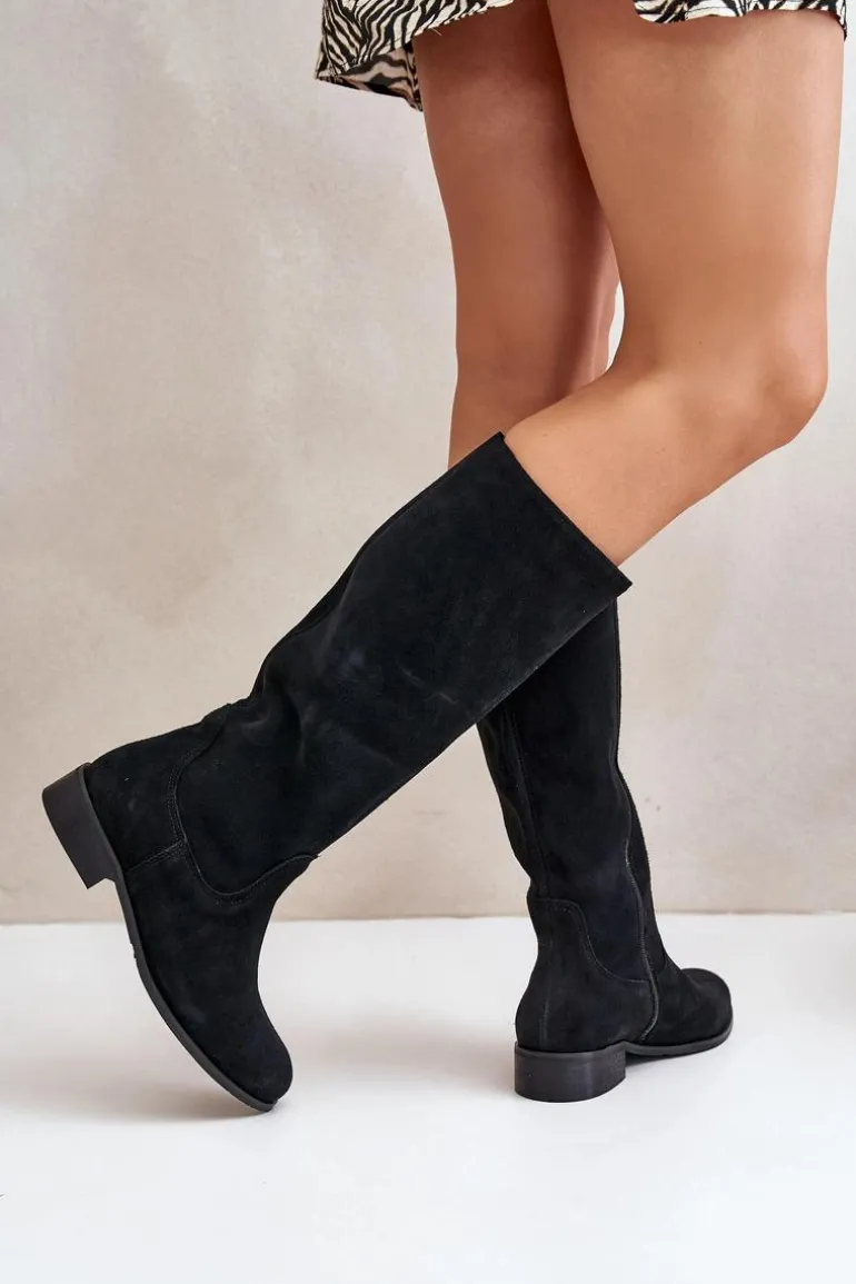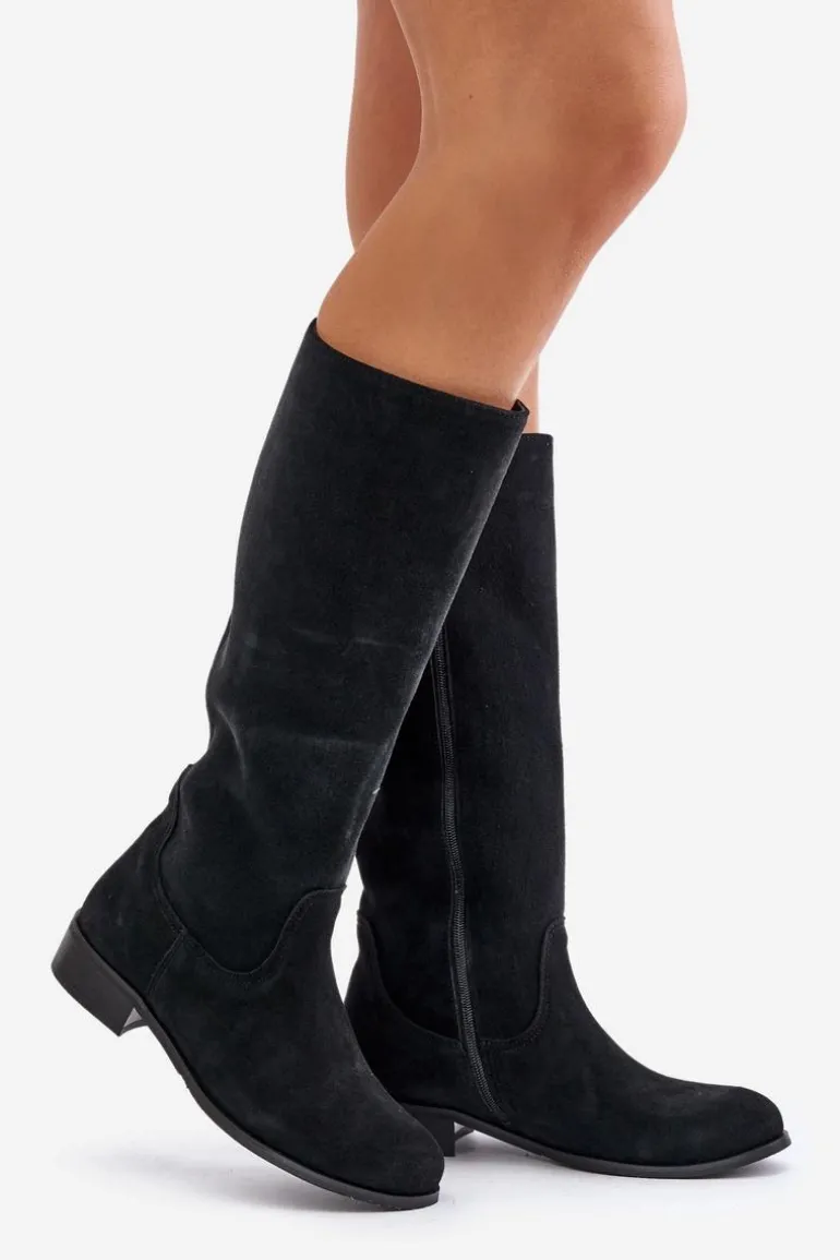 Kozaki damskie wykonane z wysokiej jakości naturalnego zamszu. Zapinane na suwak znajdujący się na boku. Osadzone na płaskim obcasie. Nie posiadają ocieplenia. Noski zaokrąglone. Zapiętek jest usztywniony. Wygodny i komfortowy w użytkowaniu model. Ten klasyczny fason świetnie sprawdzi się w wielu stylizacjach! Przy wyborze rozmiaru prosimy sugerować się tabelą rozmiarów.