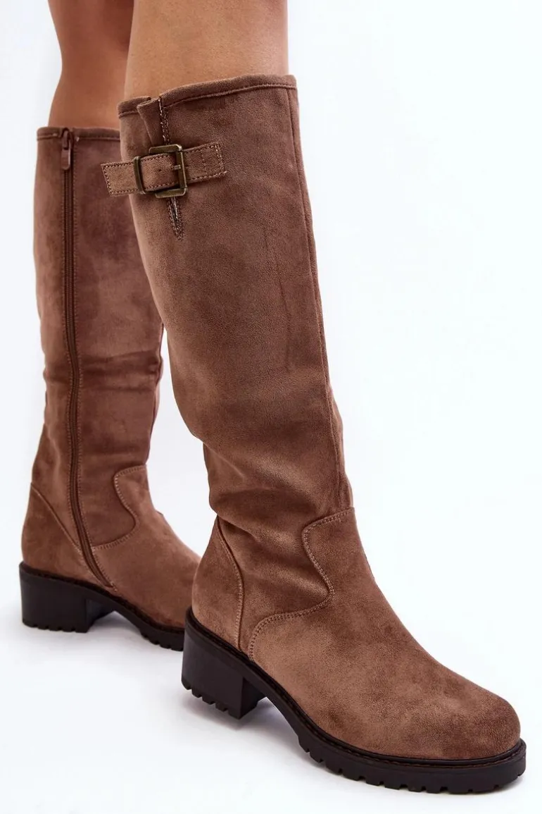 Klasyczne kozaki damskie na płaskim, stabilnym obcasie. Wykonane z eko zamszu. Cholewka przed kolano ozdobiona krótkim paskiem z klamrą. Środek ocieplony kocem obuwniczym. Noski zaokrąglone. Zapiętek usztywniony. Zapinane suwakiem. Model ten wykorzystasz do wielu jesienno-zimowych stylizacji! Przy wyborze rozmiaru prosimy kierować tabelą rozmiarów.