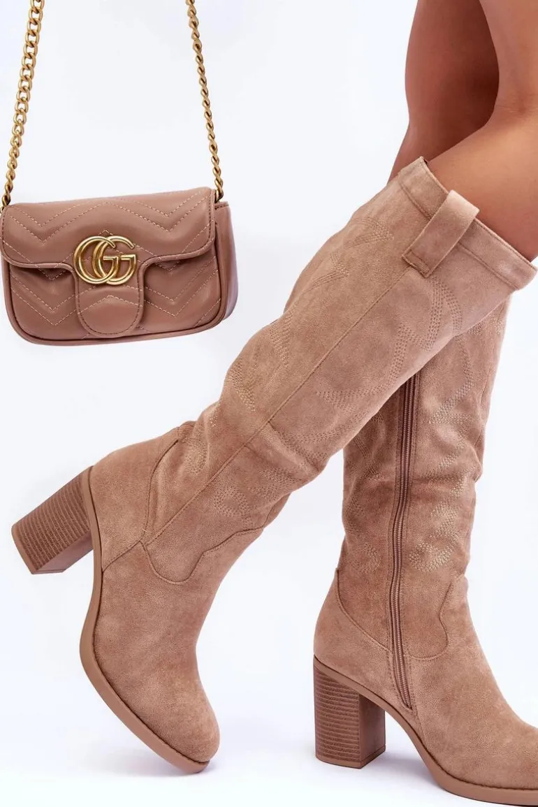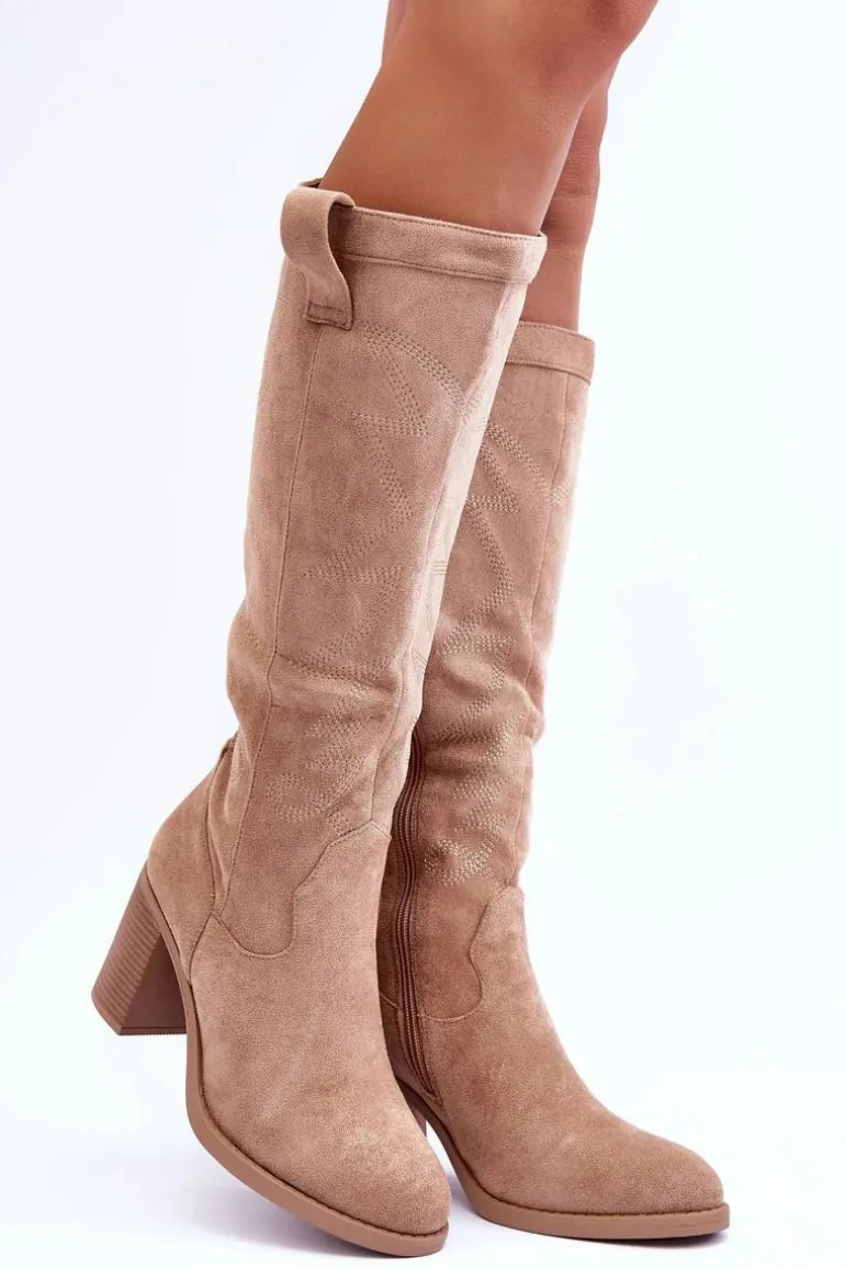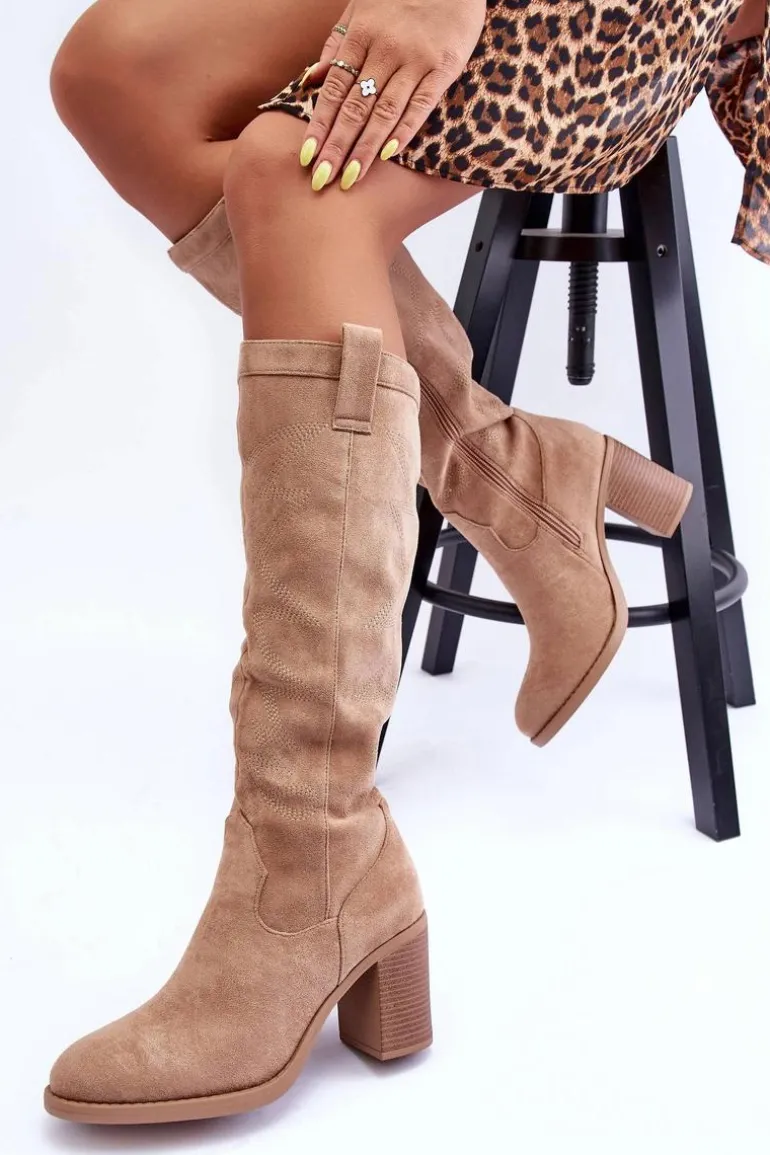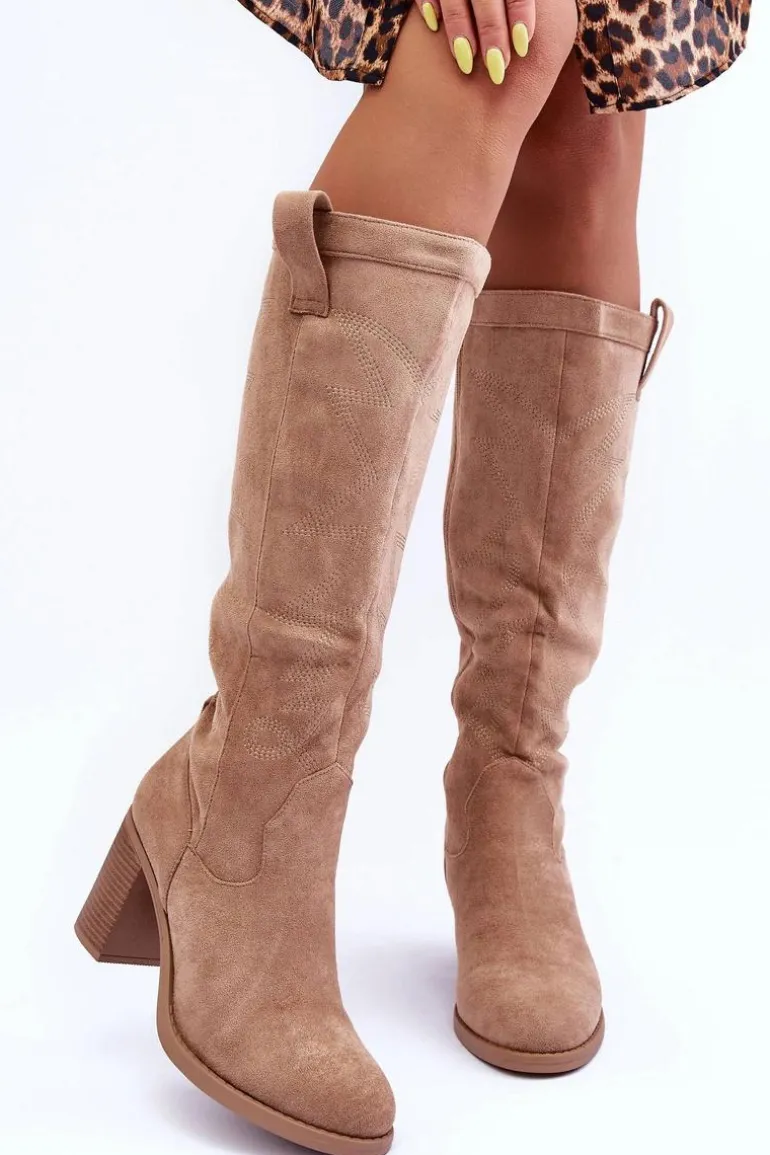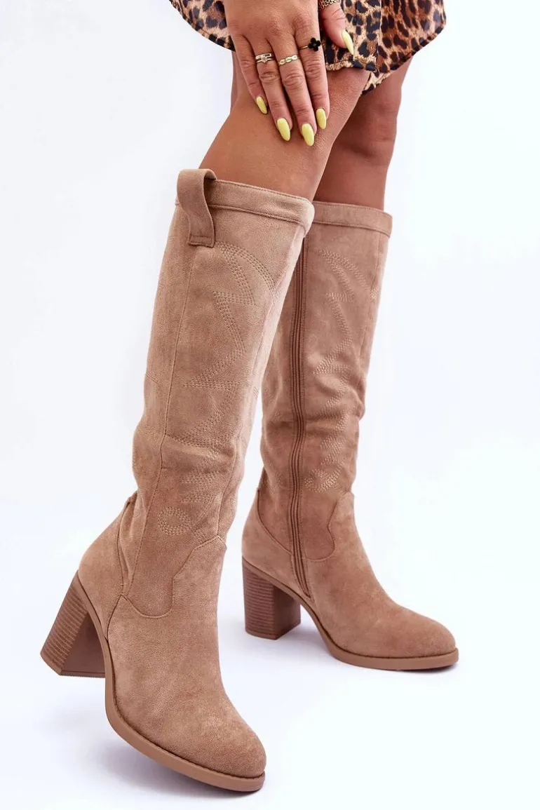 Kozaki damskie zostały wykonane z eko zamszu. Osadzone na obcasie w postaci słupka. Zapinane na suwak z boku. Dodatkowo zapiętek w tym obuwiu został usztywniony. Miękka wkładka zapewni komfortowe użytkowanie. Model ten świetnie sprawdzi się w wielu stylizacjach! Przy wyborze rozmiaru prosimy sugerować się tabelą rozmiarów.