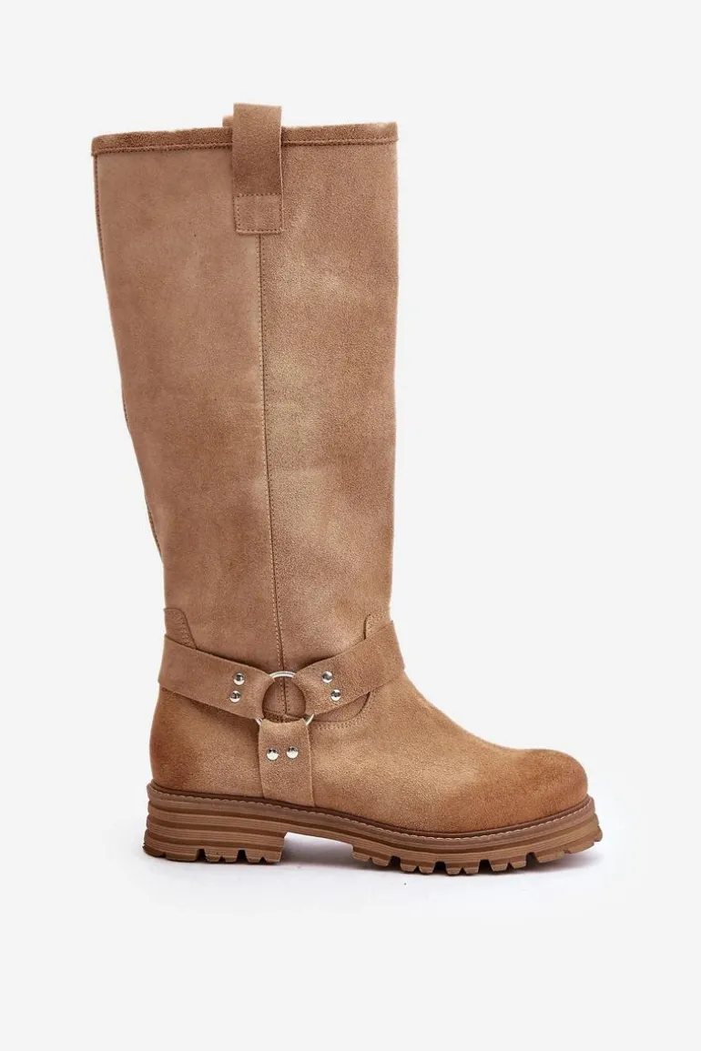 Kozaki damskie z naturalnego zamszu to połączenie elegancji i wygody. Osadzone na płaskim obcasie, zapewniają komfort noszenia przez cały dzień. Cholewka sięga przed kolano, co dodaje szyku i świetnie komponuje się z różnymi stylizacjami. Zaokrąglone noski nadają im subtelnego wyglądu. Model wsuwany z praktycznym zapięciem na zamek ułatwia zakładanie, a ozdobne paski na cholewce dodają charakteru. Idealne na co dzień i wyjątkowe okazje, te kozaki będą doskonałym uzupełnieniem Twojej garderoby! Przy wyborze rozmiaru prosimy sugerować się tabelą rozmiarów.