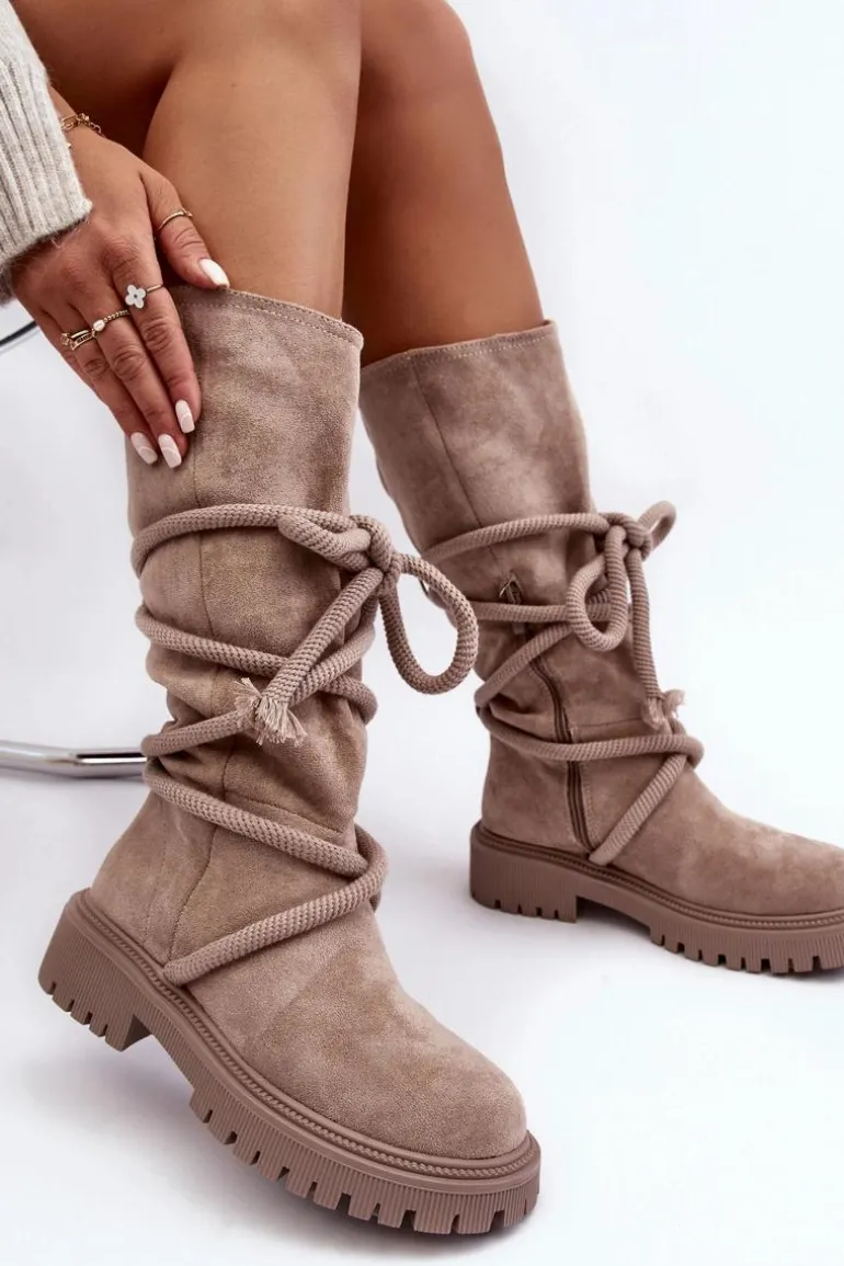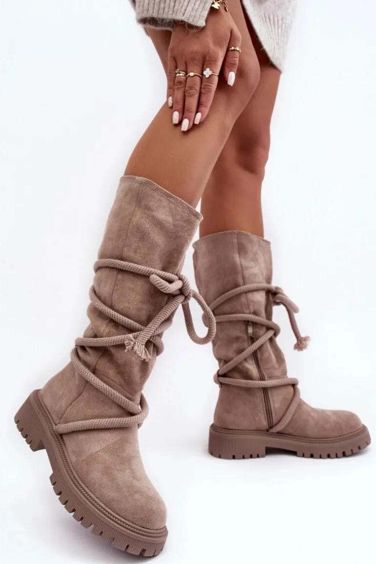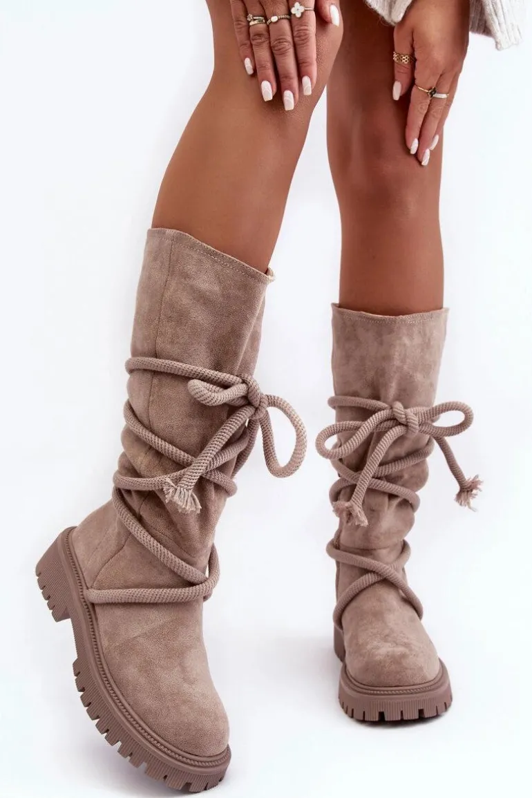 Zamszowe Kozaki Damskie Z Wiązaniem Beżowe Tanive