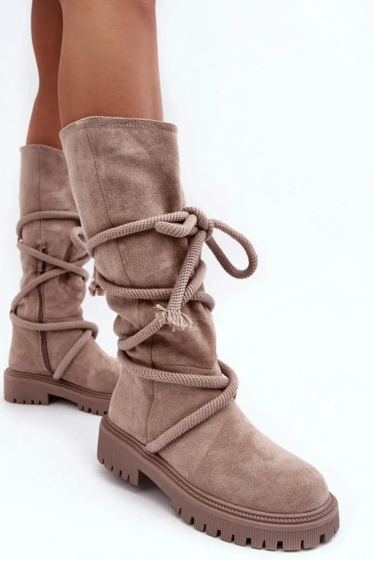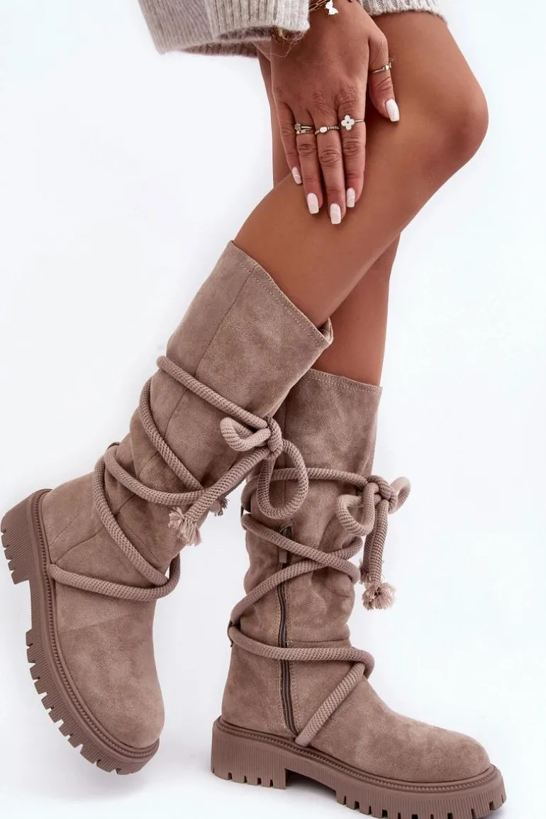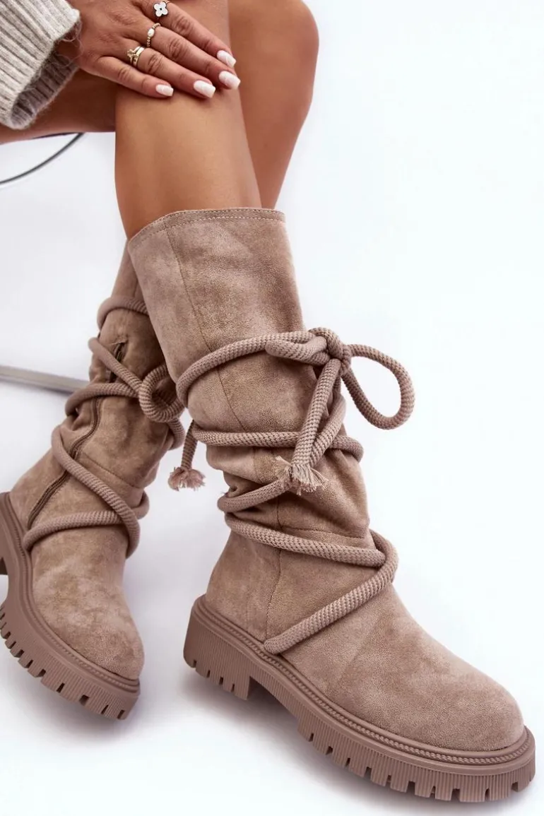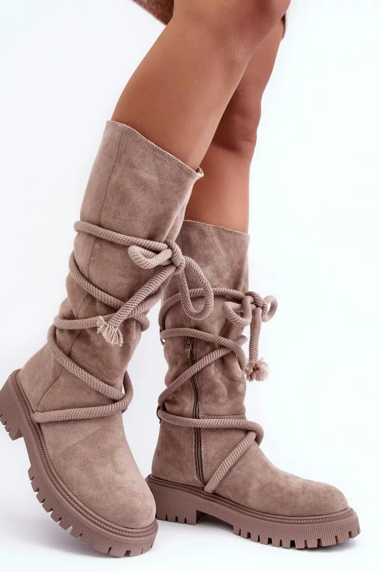 Zamszowe Kozaki Damskie Z Wiązaniem Beżowe Tanive