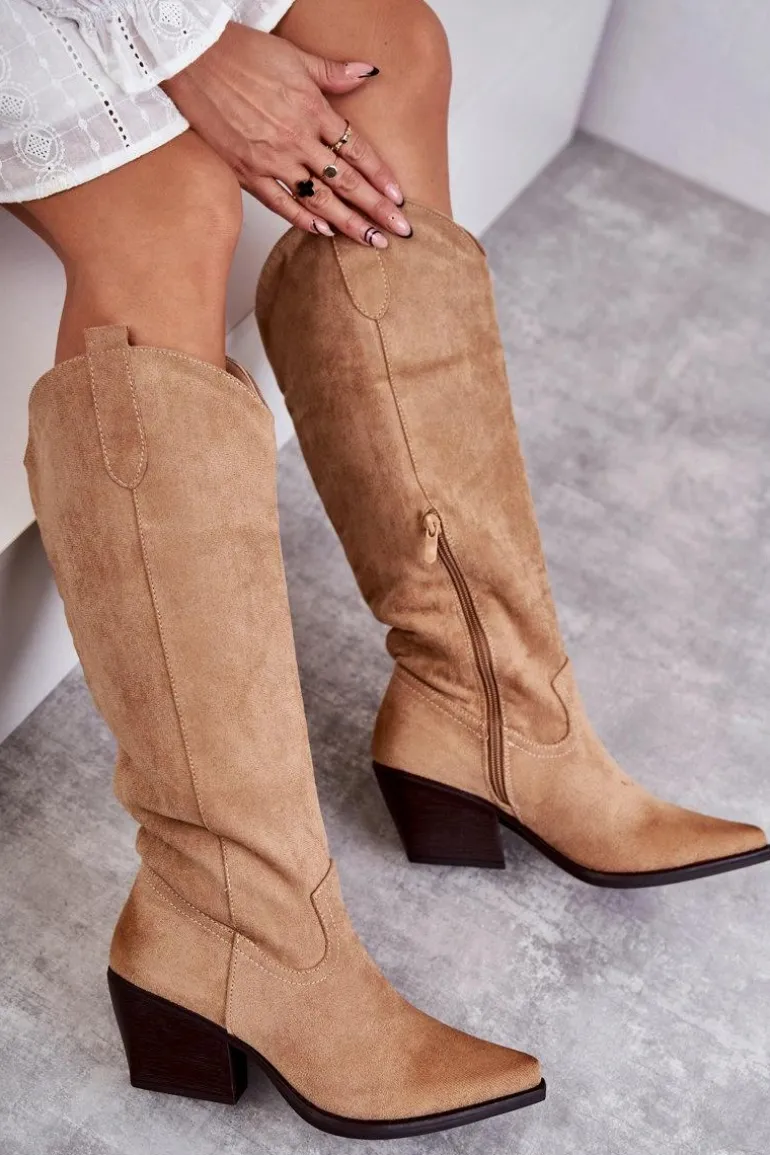 Kozaki – kowbojki zostały wykonane z przyjemnego w dotyku eko zamszu. Posiadają delikatne przeszycia na przodzie. Kozaki o fasonie kowbojek posiadają nosek w szpic oraz masywny obcas w postaci słupka. Model wsuwany z dodatkowym suwakiem z boku cholewki. Wkładka wykonana z eko skóry. Kozaki posiadają usztywniany zapiętek. Ten wyjątkowy model powinien być właśnie Twój! Przy wyborze rozmiaru prosimy sugerować się tabelą rozmiarów.