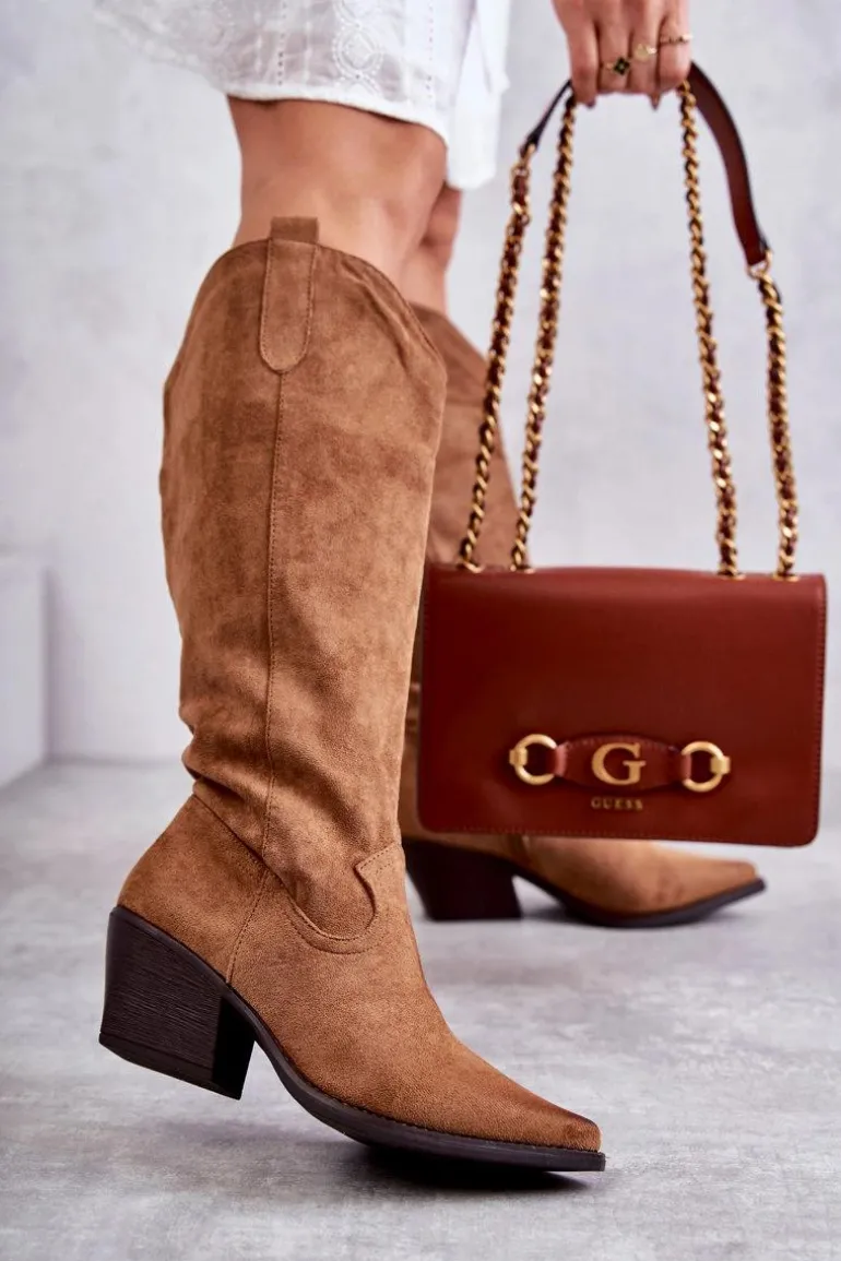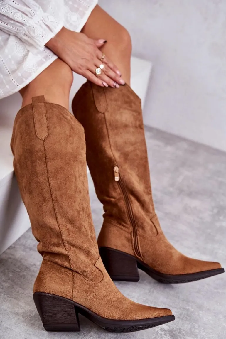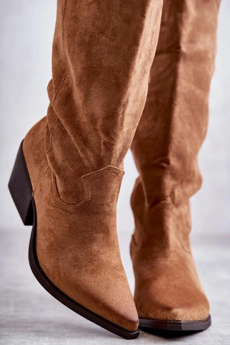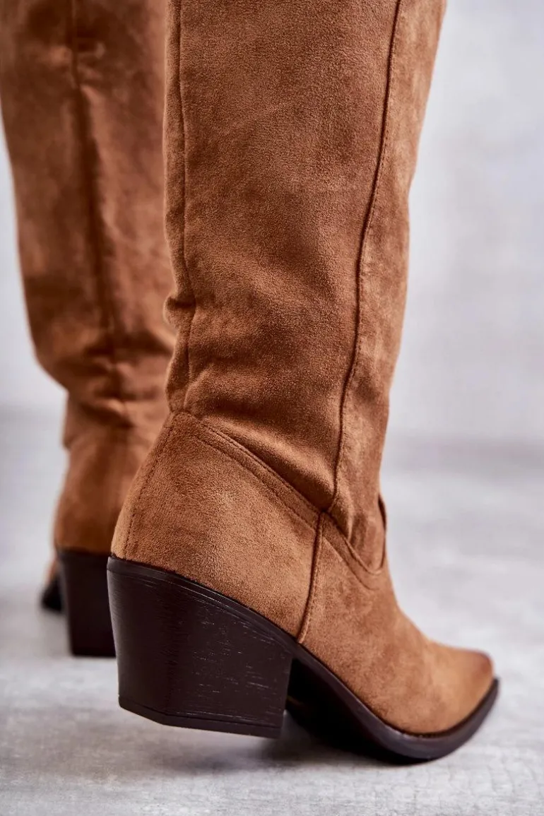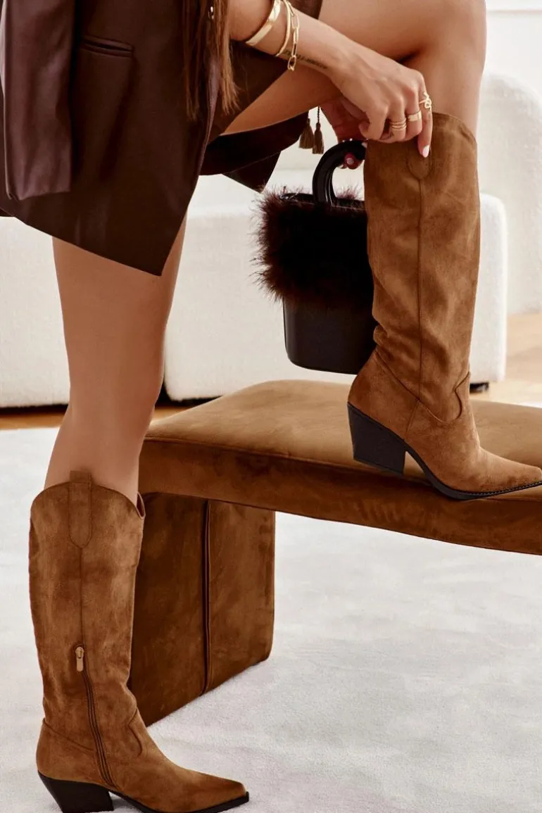 Kozaki – kowbojki zostały wykonane z przyjemnego w dotyku eko zamszu. Posiadają delikatne przeszycia na przodzie. Kozaki o fasonie kowbojek posiadają nosek w szpic oraz masywny obcas w postaci słupka. Model wsuwany z dodatkowym suwakiem z boku cholewki. Wkładka wykonana z eko skóry. Kozaki posiadają usztywniany zapiętek. Ten wyjątkowy model powinien być właśnie Twój! Przy wyborze rozmiaru prosimy sugerować się tabelą rozmiarów.