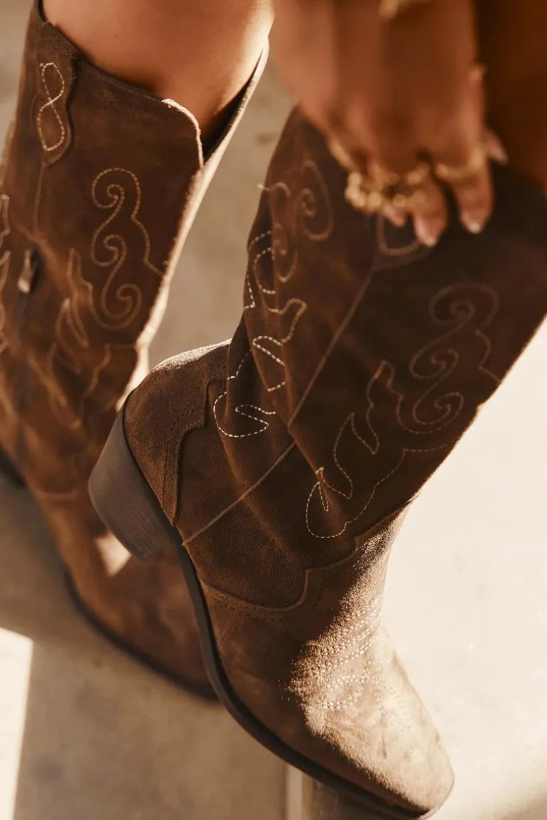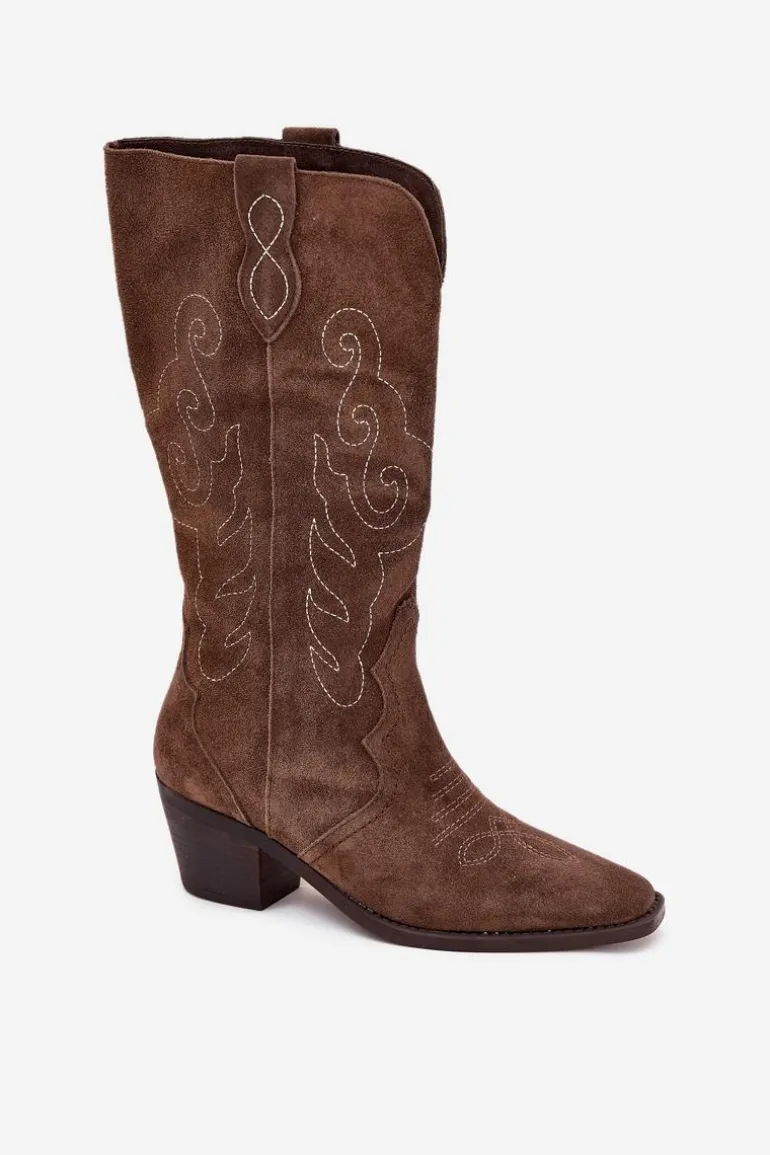 Kozaki damskie w stylu kowbojek to niezwykle modne obuwie na sezon jesienno-zimowy. Wykonane z naturalnego zamszu. Stabilny, niski obcas sprawia, że są one wygodne i idealne do noszenia na co dzień. Model wsuwany z dodatkowym zapięciem na suwak ułatwia zakładanie butów. Cholewka z przeszyciami, co dodaje im charakterystycznego, kowbojskiego stylu. Stylowy fason sprawia, że te kozaki będą doskonałym wyborem do różnych stylizacji, zarówno na co dzień, jak i na specjalne okazje. Przy wyborze rozmiaru prosimy sugerować się tabelą rozmiarów.