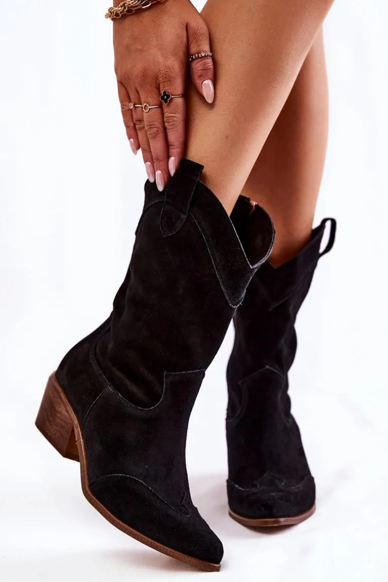 Kozaki – kowbojki zostały wykonane z przyjemnej w dotyku skóry naturalnej. Posiadają delikatne przeszycia na przodzie. Kozaki o fasonie kowbojek posiadają nosek w szpic oraz masywny obcas w postaci słupka. Model wsuwany z suwakiem z boku cholewki. Miękka, delikatnie ocieplona wkładka. Kozaki posiadają usztywniany zapiętek. Ten wyjątkowy model powinien być właśnie Twój! Przy wyborze rozmiaru prosimy sugerować się tabelą rozmiarów.