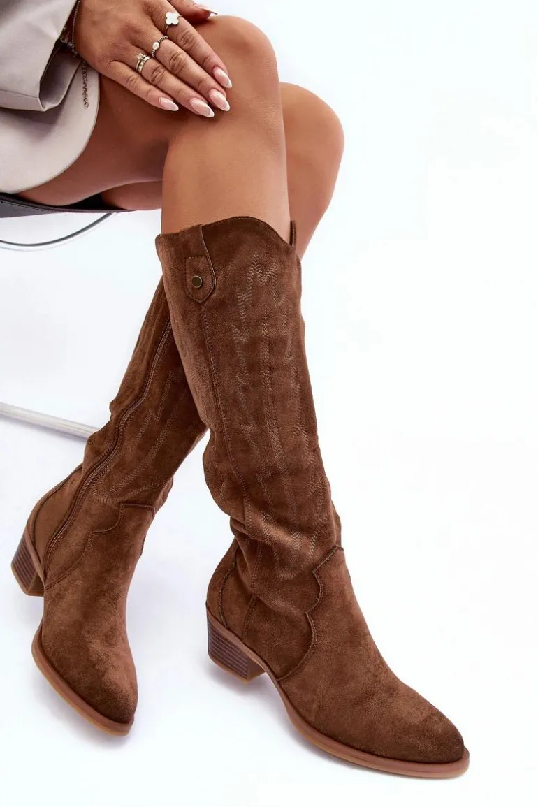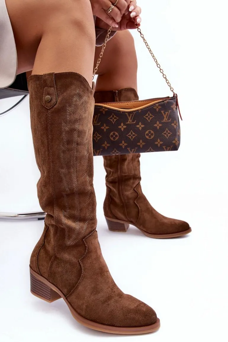 Ten model skradnie serce niejednej miłośniczce kozaków w stylu kowbojek! Świetnie sprawdzą się podczas jesiennych stylizacji! Model wykonany z miłego eko zamszu z delikatnymi przeszyciami na cholewce. Kozaki zapinane są na suwak. Osadzone na niskim, stabilnym obcasie. Ocieplone wewnątrz kocem obuwniczym. Nosek w szpic optycznie wysmukli nogi. Kozaki posiadają usztywniany zapiętek. Przy wyborze rozmiaru prosimy sugerować się tabelą rozmiarów.