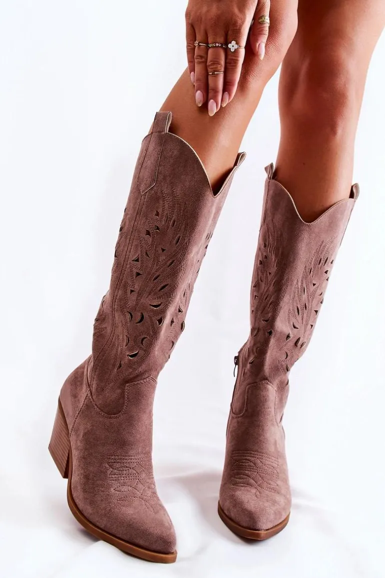 Wygodnie i stylowo – tak właśnie poczujesz się w tych kozakach! Ażurowa cholewka została wykonana z eko zamszu. Obuwie posiada eko skórzaną wkładkę, usztywniany zapiętek oraz suwak ułatwiający zakładanie obuwia. Osadzone na obcasie w postaci słupka. Nosek w szpic. Świetnie sprawdzą się w stylizacjach z dłuższymi spódnicami czy jeansami. Przy wyborze rozmiaru prosimy sugerować się tabelą rozmiarów.
