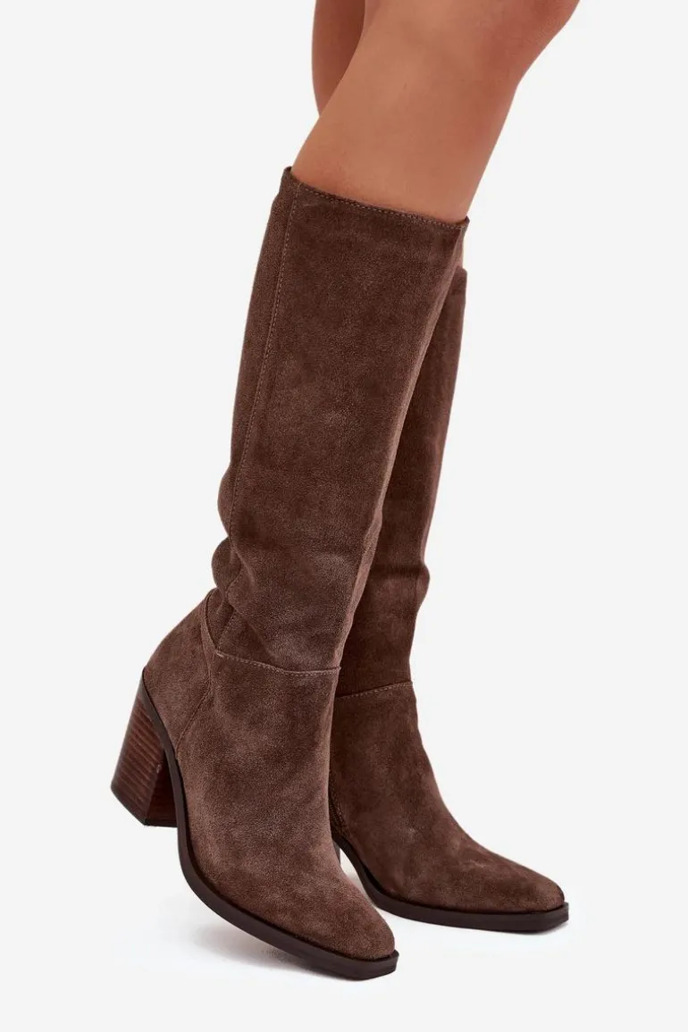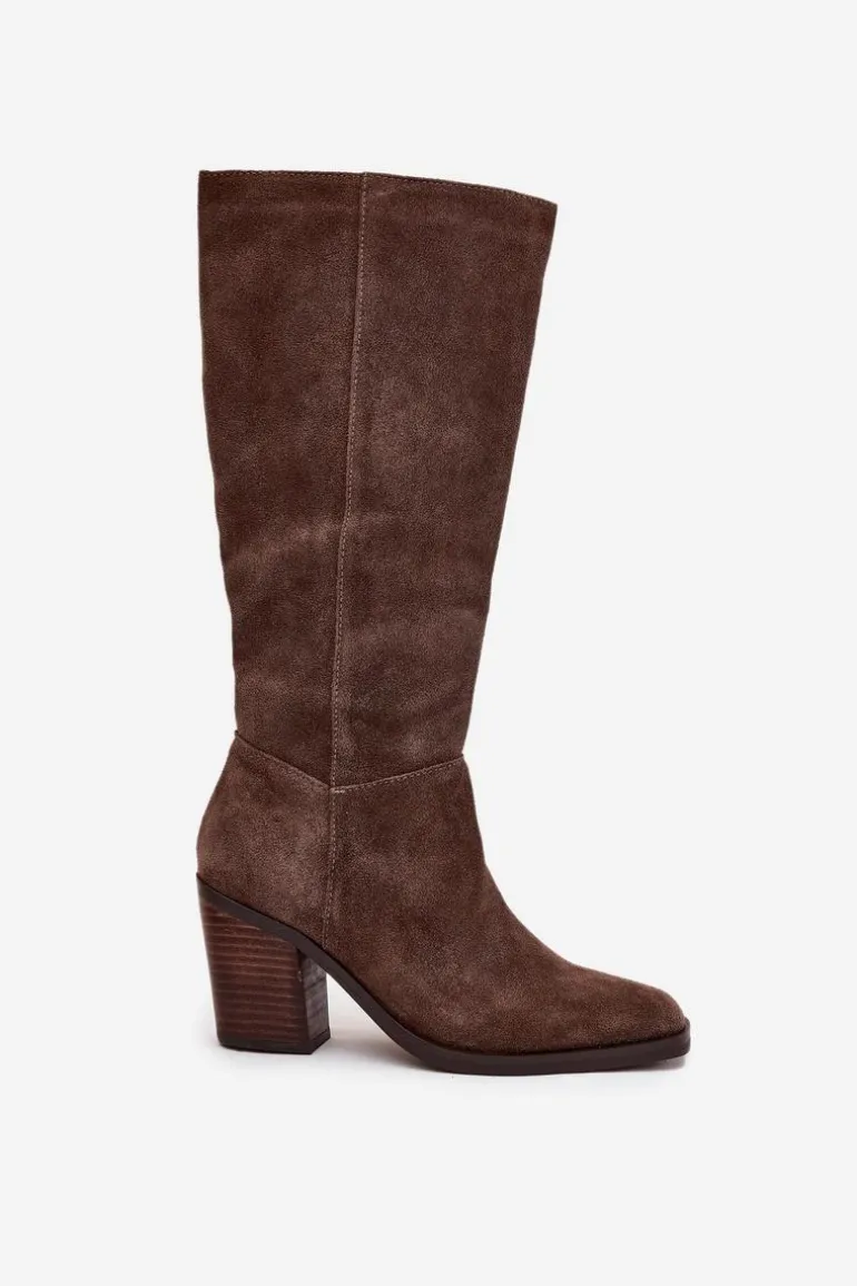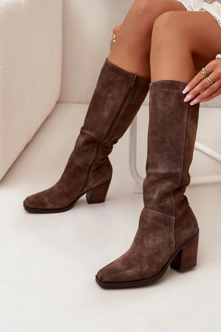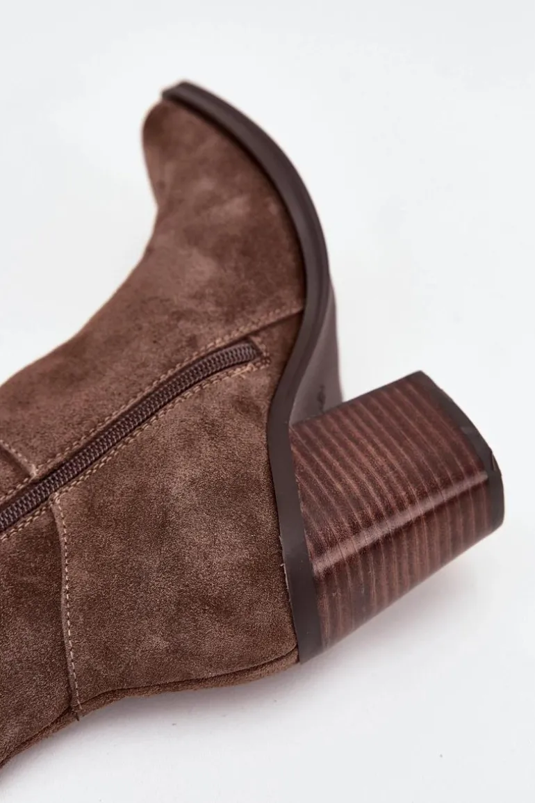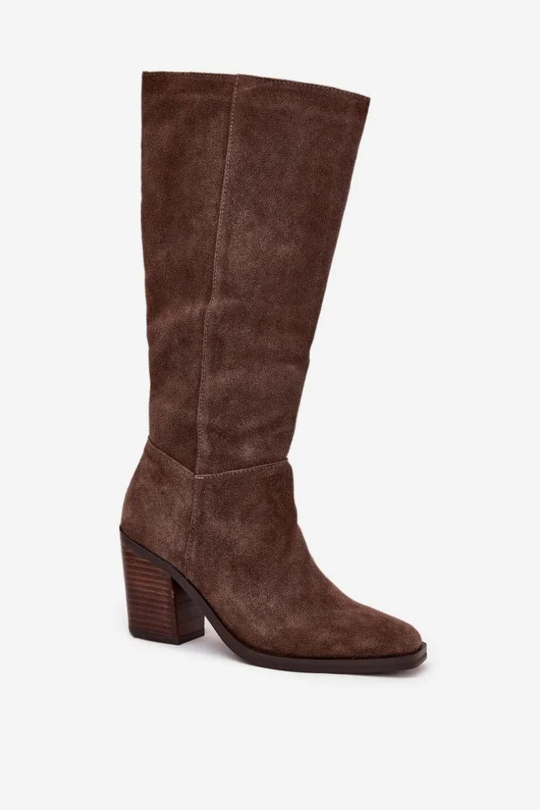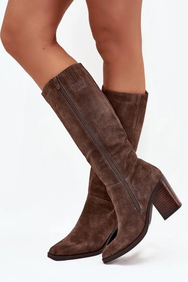 Zamszowe kozaki na słupku z zamkiem brązowe Lissara