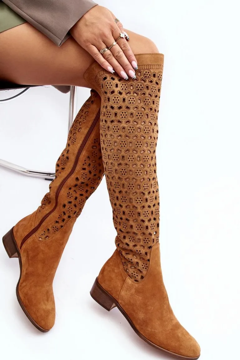Zamszowe Kozaki Z Ażurowym Wzorem Camel Pointe