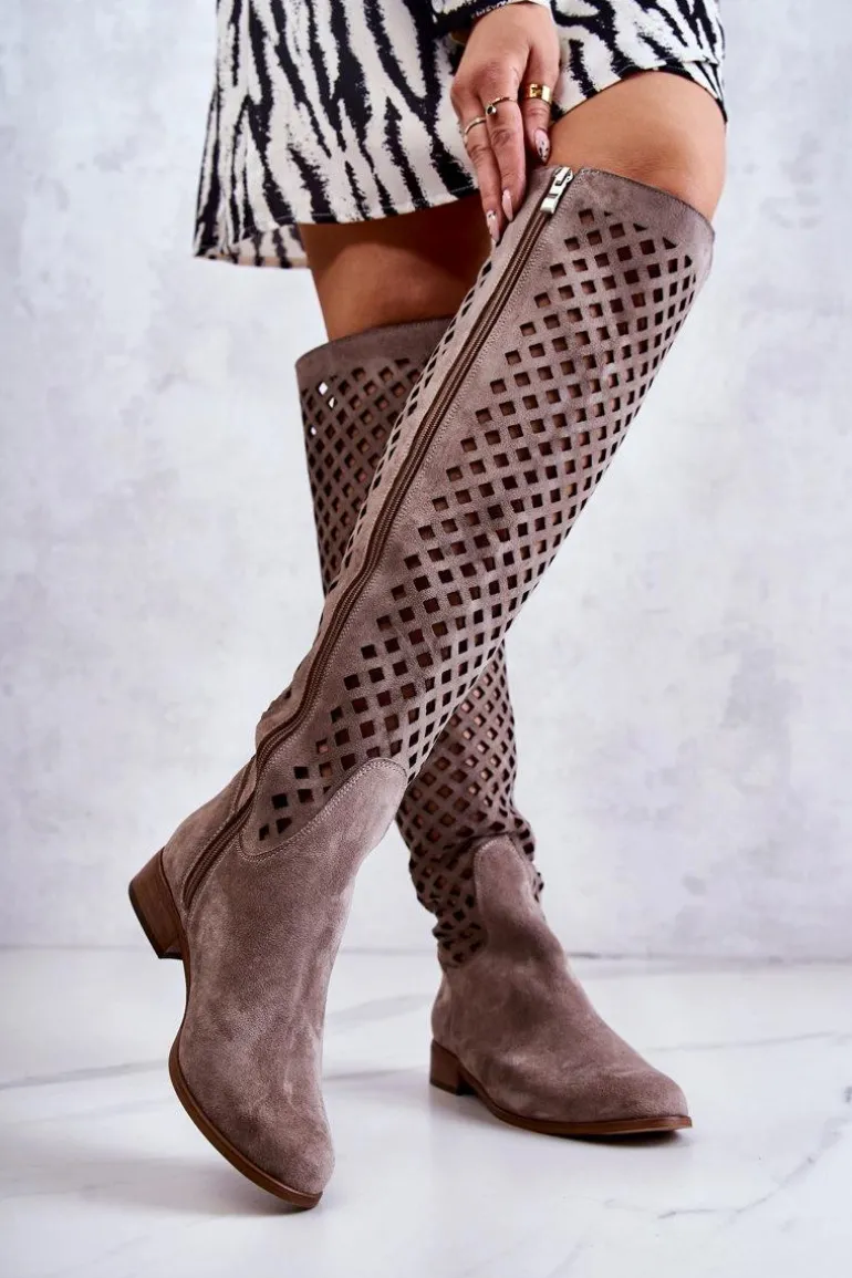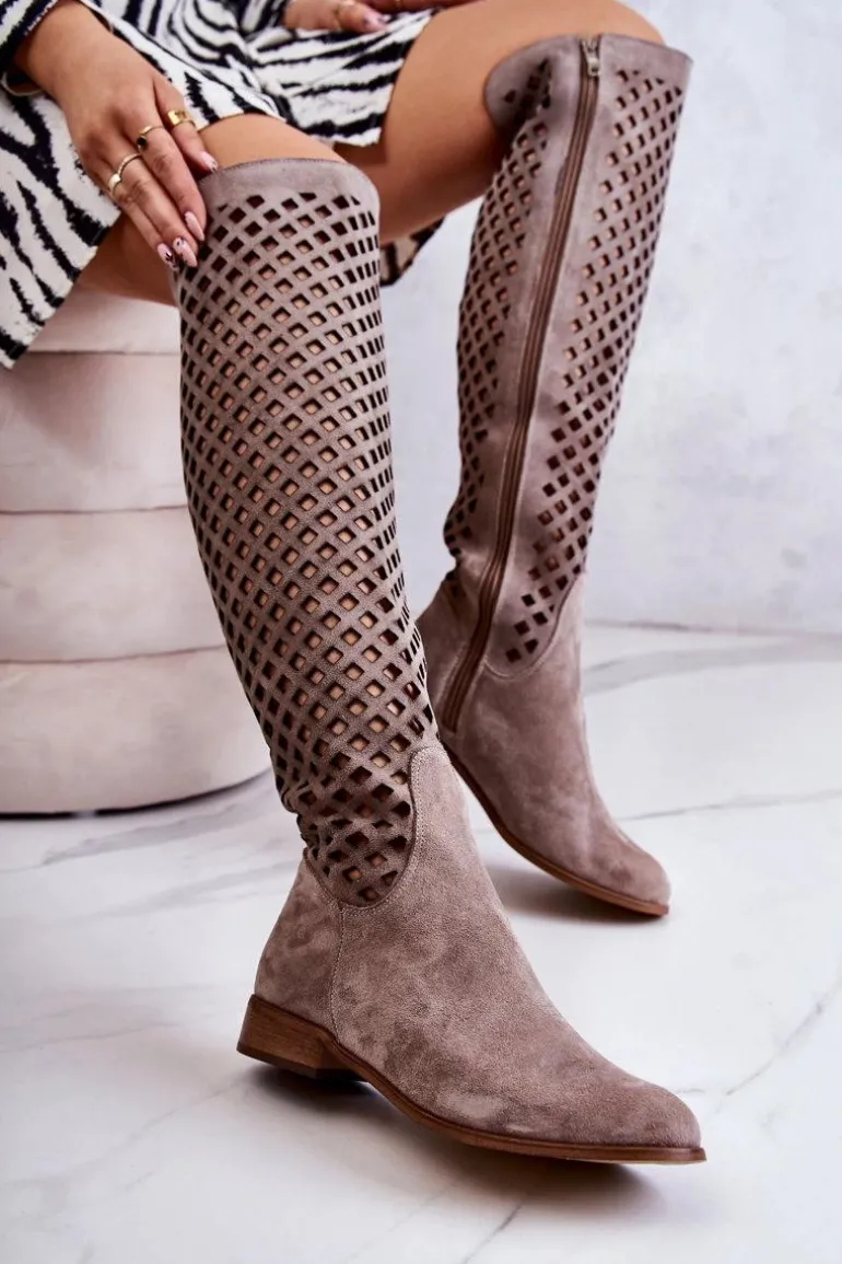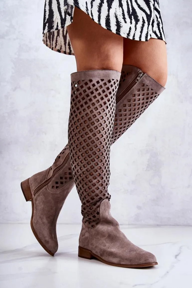 Piękne kozaki damskie od polskiego producenta. Każdy model wykonany jest z naturalnych skór wysokiej jakości. Ażurowe kozaki wykonane są z miękkiego, naturalnego zamszu. Model z zaokrąglonym noskiem. Cholewka na całości zapinana na suwak. Ozdobne wycięcie na górze. Płaski obcas oraz skórzana, miękka wkładka to gwarancja stabilności oraz komfortu podczas użytkowania. Idealny model na sezon wiosenno-letni! Przy wyborze rozmiaru prosimy sugerować się tabelą rozmiarów.