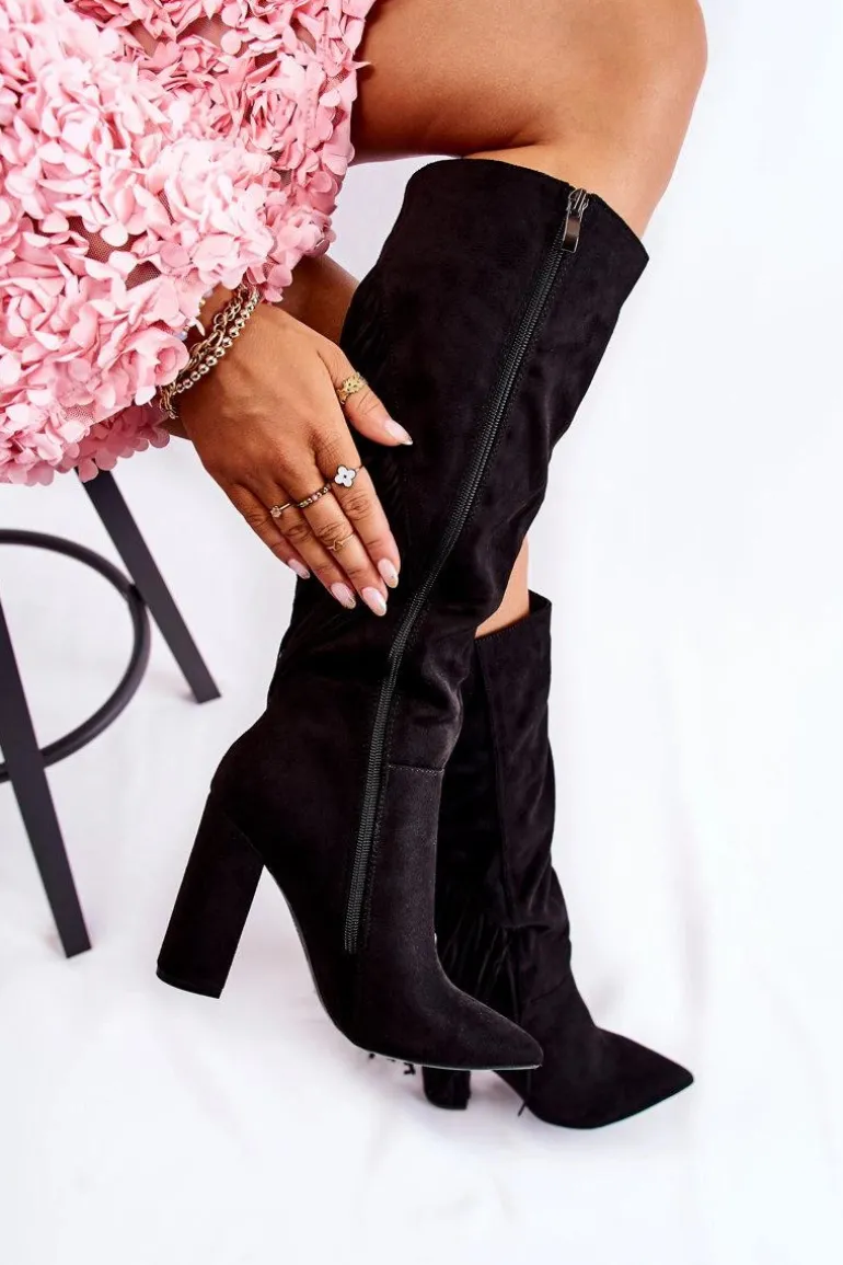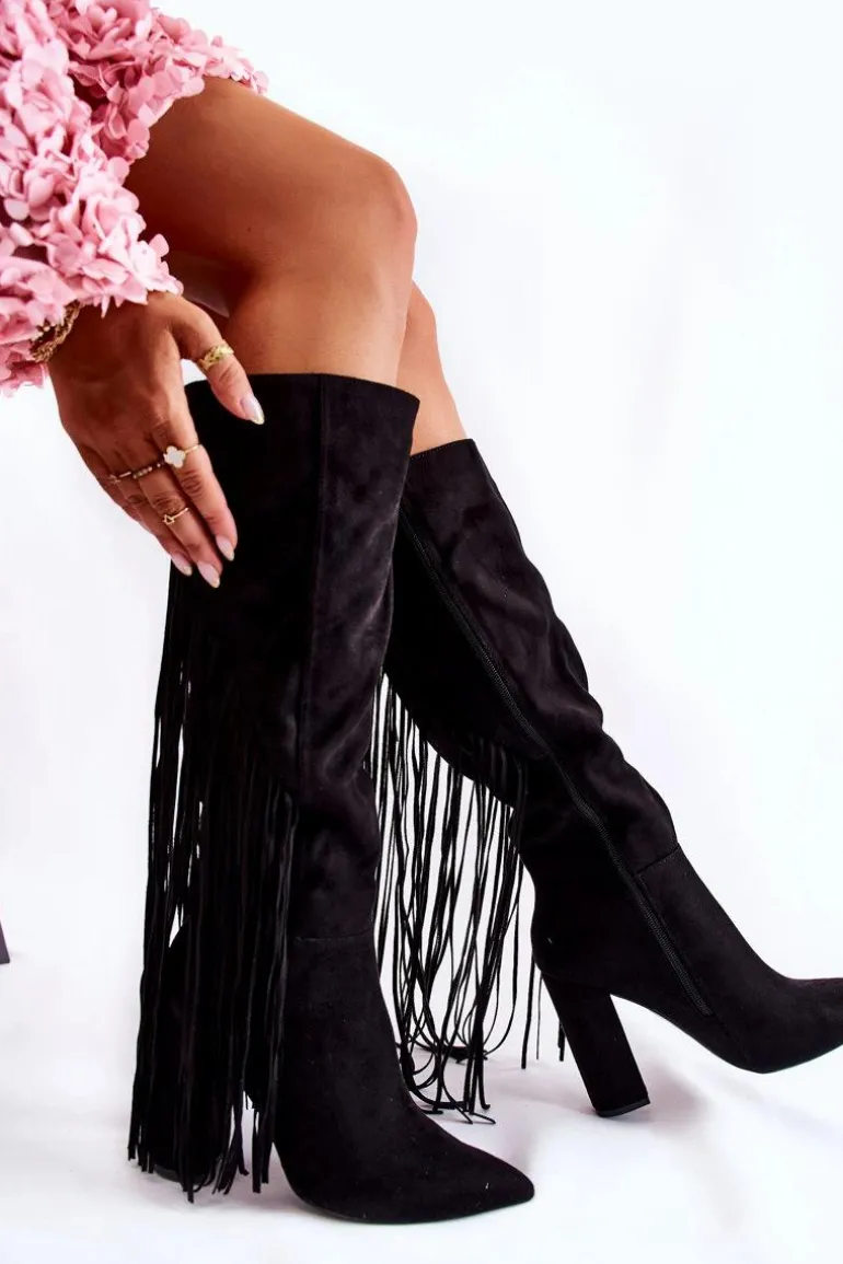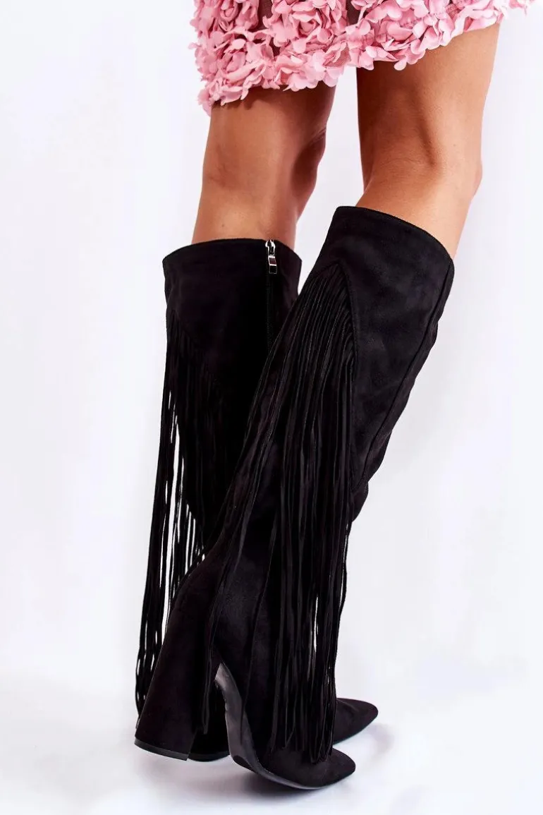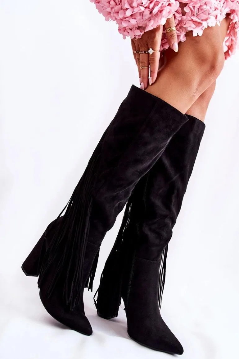 Modne kozaki zostały wykonane z eko zamszu. Model ten osadzono na obcasie w postaci stabilnego słupka. Nosek w szpic wysmukli stopę. Efektowne frędzle z tyłu cholewki idealnie komponują się z całością. Kozaki są zapinane z boku cholewki na suwak. Wkładka wykonana z eko skóry. Model ten zachwyci niejedną miłośniczkę wysokich obcasów. Przy wyborze rozmiaru prosimy sugerować się tabelą rozmiarów.
