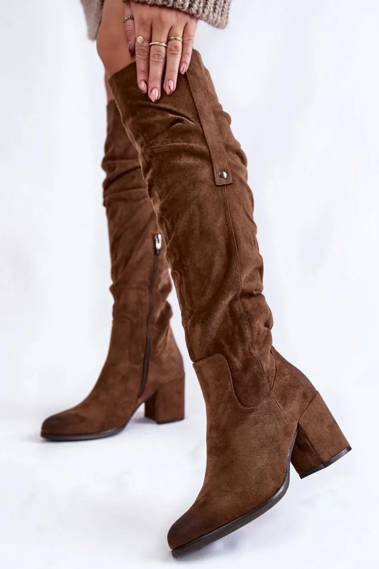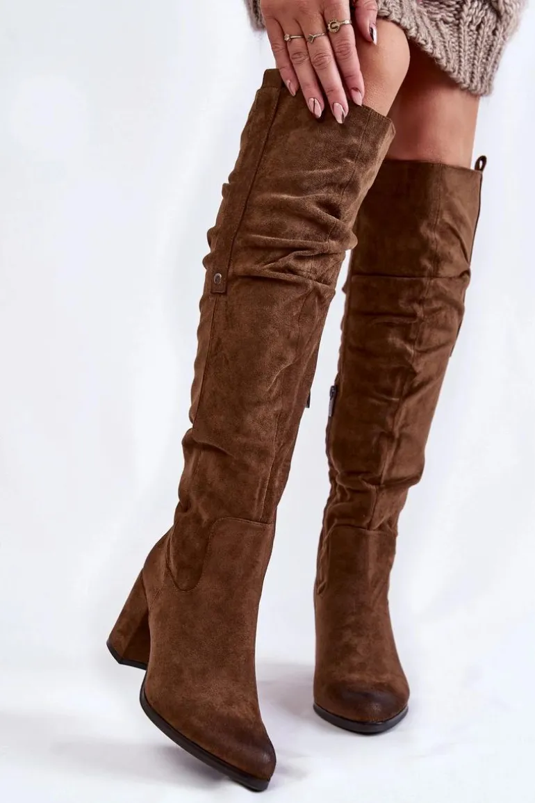 Rewelacyjne kozaki damskie zostały wykonane z wysokiej jakości eko zamszu z dbałością o szczegóły. Model ten został osadzony na niskim obcasie w postaci słupka. Kozaki z cholewką za kolano zostały przyozdobione delikatnym marszczeniem oraz pojedynczą napą z boku cholewki. Zapinane na suwak oraz wsuwane. Dodatkowo zapiętek jest usztywniany. Kozaki zostały ocieplone delikatnym futerkiem. Przy wyborze rozmiaru prosimy sugerować się tabelą rozmiarów.