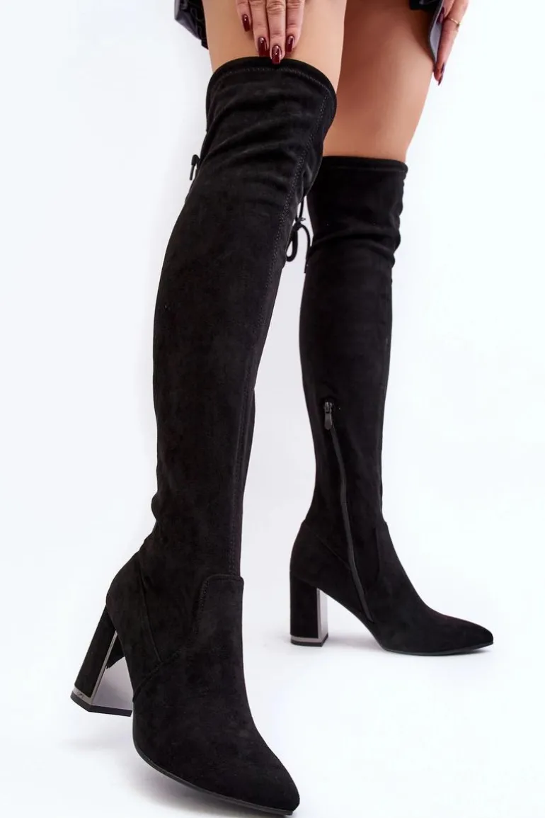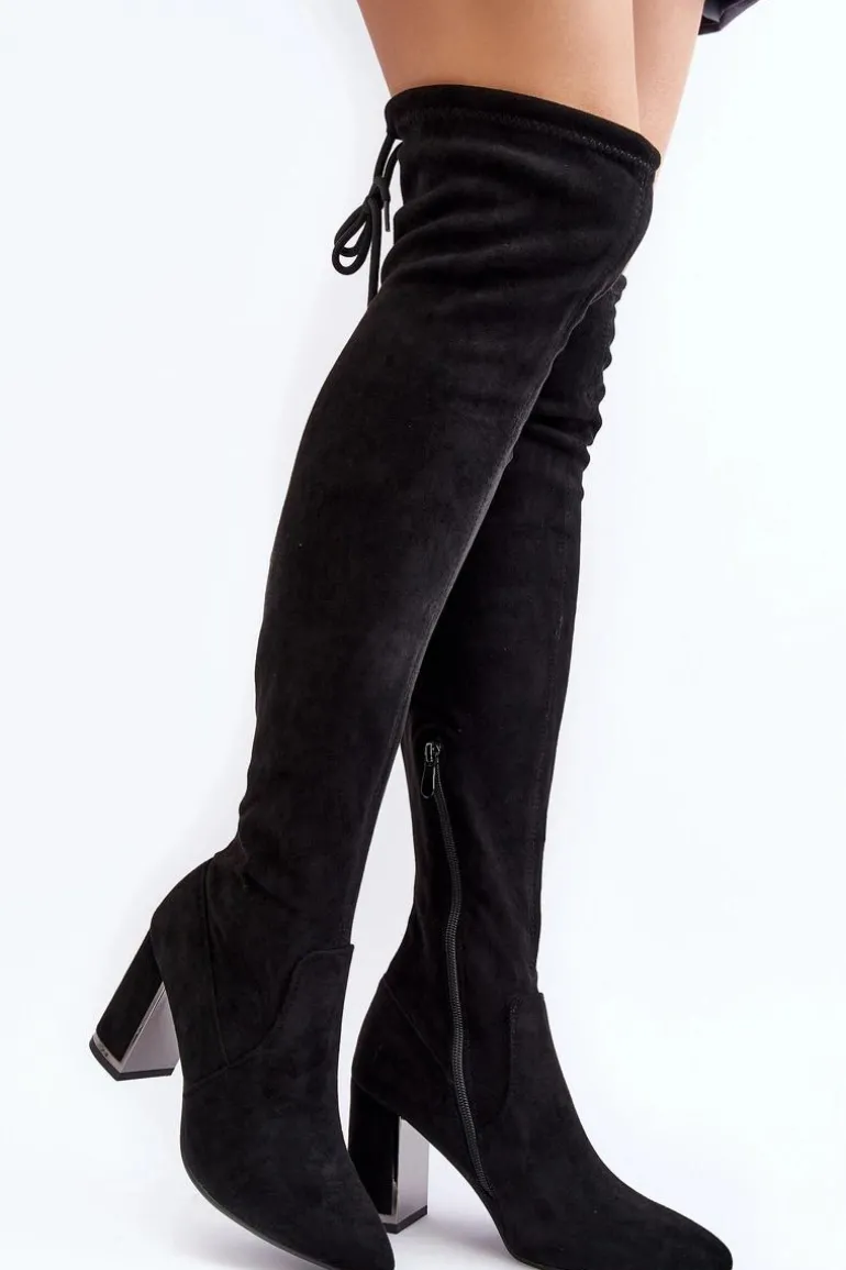 Kozaki damskie z cholewką za kolano. Wykonane z eko zamszu. Osadzone na obcasie w postaci słupka, który wzbogacony został lustrzanym elementem. Na górze cholewki znajduje się wiązanie. Model wsuwany z dodatkowym suwakiem. W środku ocieplone na wysokości stopy. Idealny model do sukienek mini czy spódniczek. Koniecznie powinnaś je mieć! Przy wyborze rozmiaru prosimy sugerować się tabelą rozmiarów.