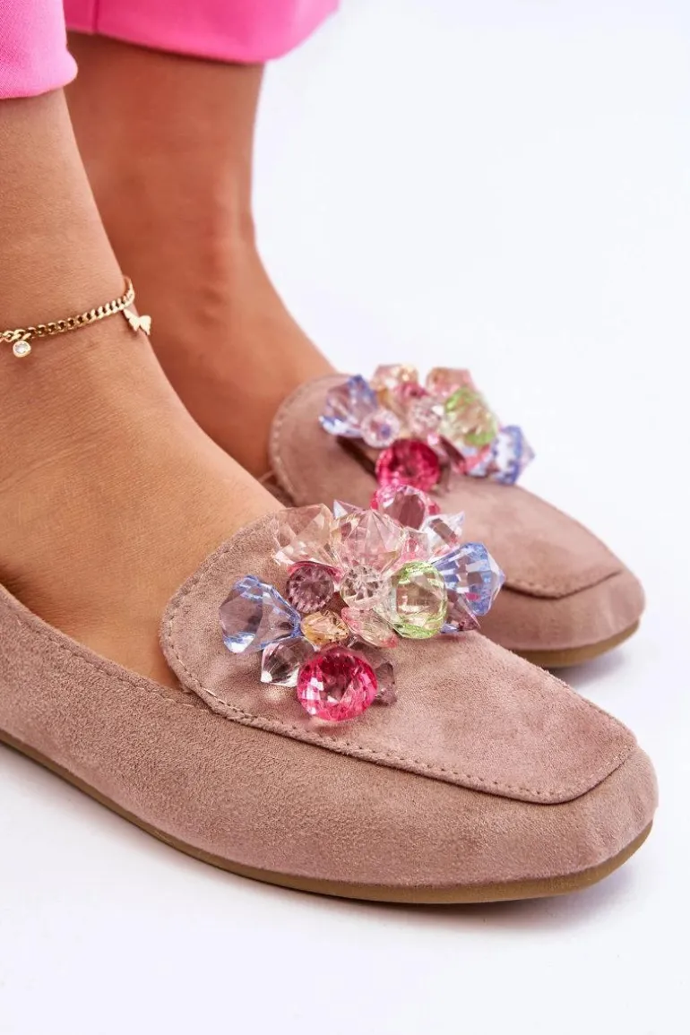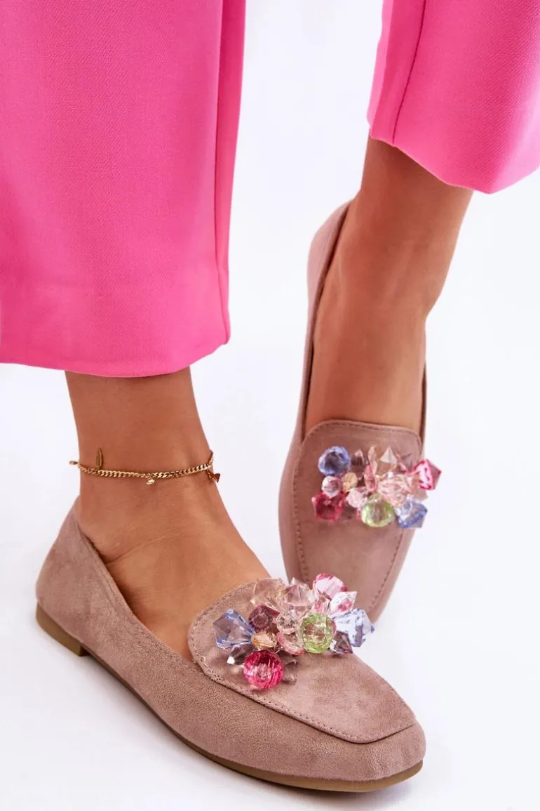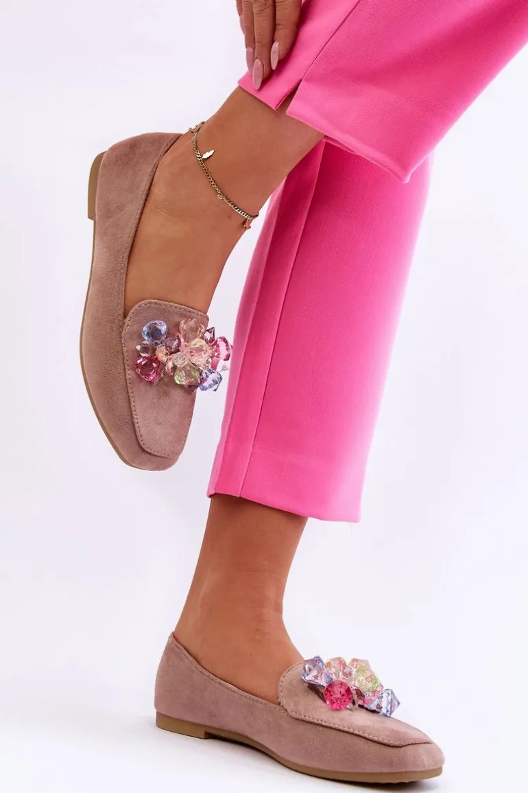 Zamszowe Mokasyny Z Ozdobnymi Kryształami Ciemnobeżowe Arvilla