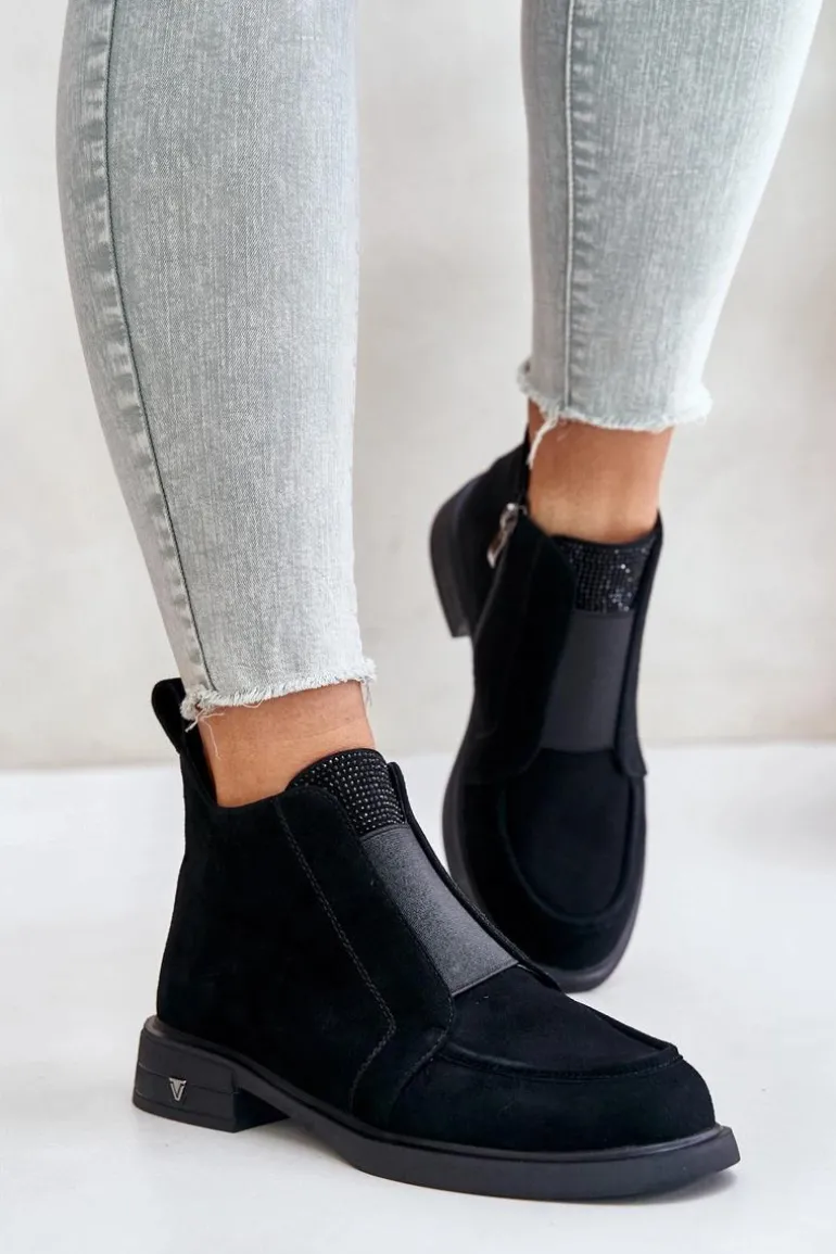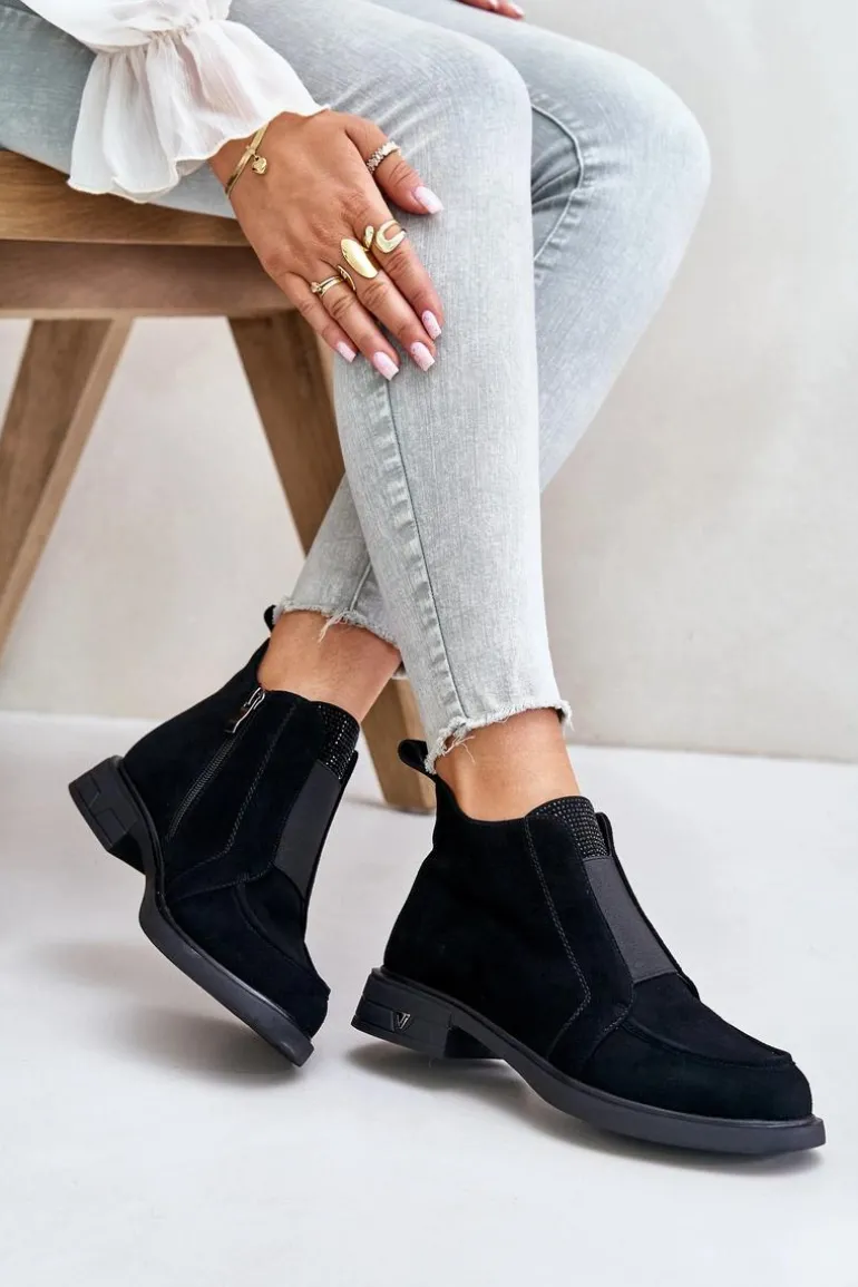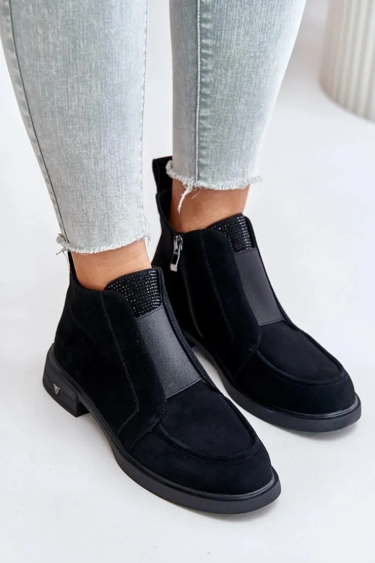 Botki damskie z niską cholewką do kostki. Wykonane z naturalnego zamszu. Osadzone na płaskim obcasie, który zapewni stabilność na każdym kroku. Noski zaokrąglone. Zapinanie na zamek ułatwia szybkie zakładanie i zdejmowanie obuwia. Model ten wyróżnia się elastyczną wstawką oraz zdobieniem na języku. Przy wyborze rozmiaru prosimy sugerować się tabelą rozmiarów.