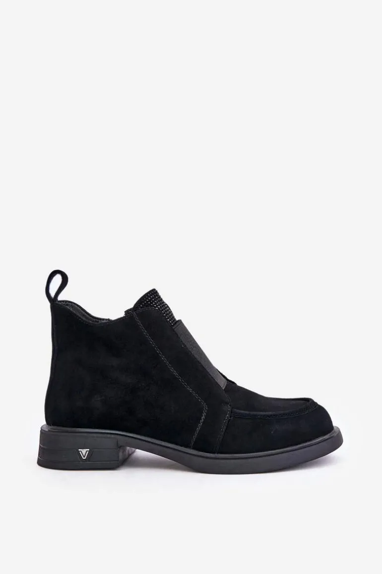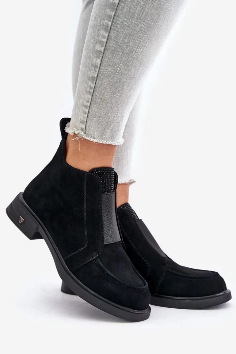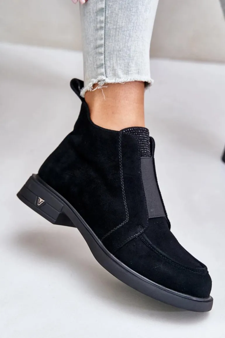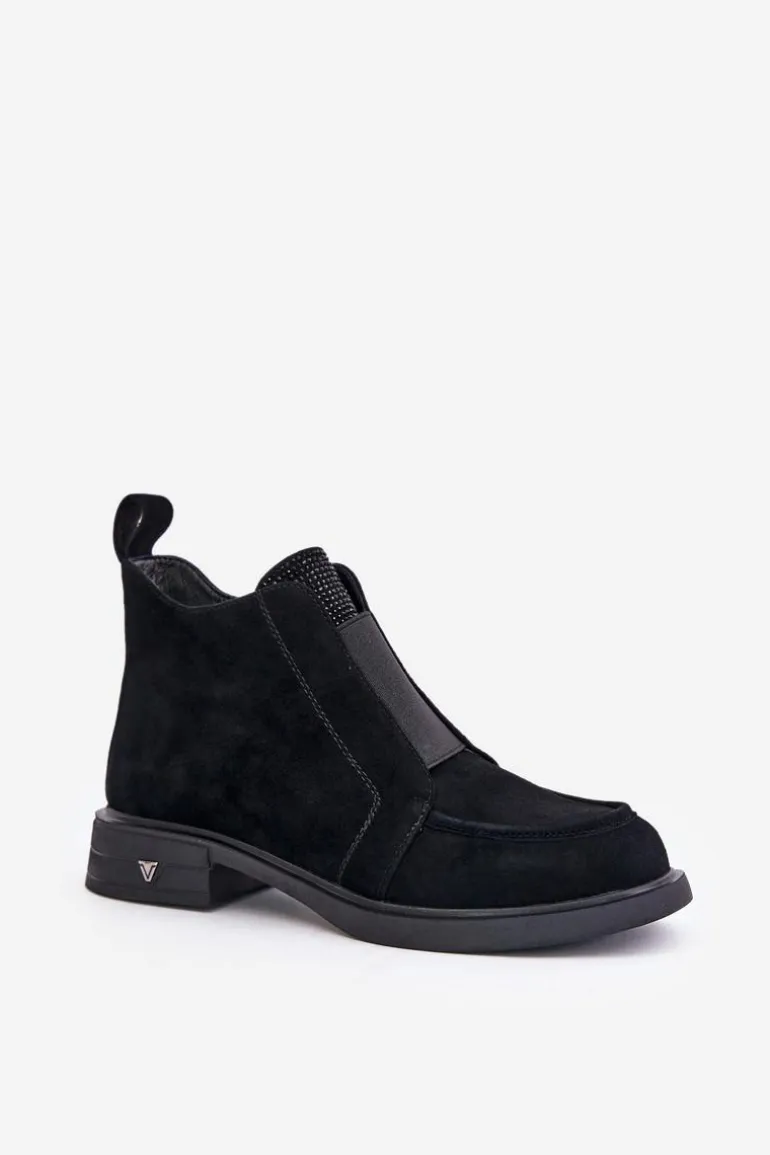 Botki damskie z niską cholewką do kostki. Wykonane z naturalnego zamszu. Osadzone na płaskim obcasie, który zapewni stabilność na każdym kroku. Noski zaokrąglone. Zapinanie na zamek ułatwia szybkie zakładanie i zdejmowanie obuwia. Model ten wyróżnia się elastyczną wstawką oraz zdobieniem na języku. Przy wyborze rozmiaru prosimy sugerować się tabelą rozmiarów.