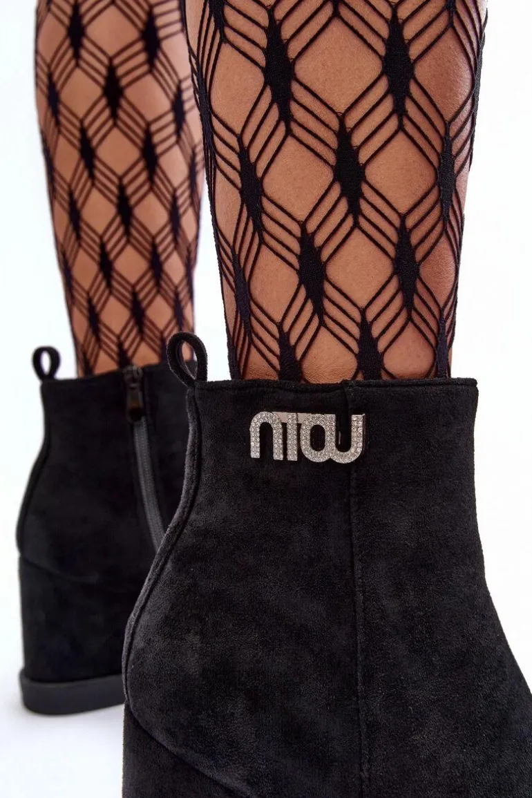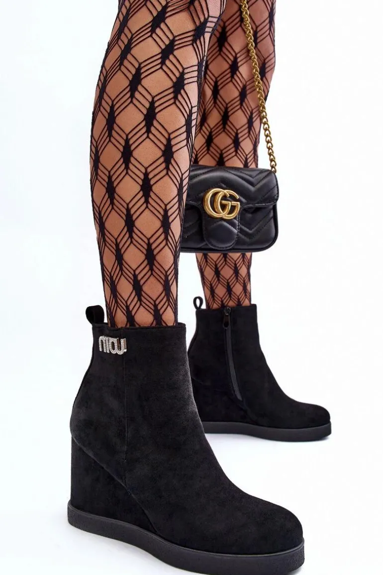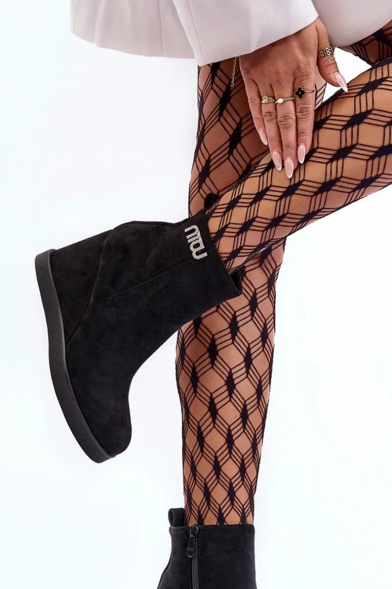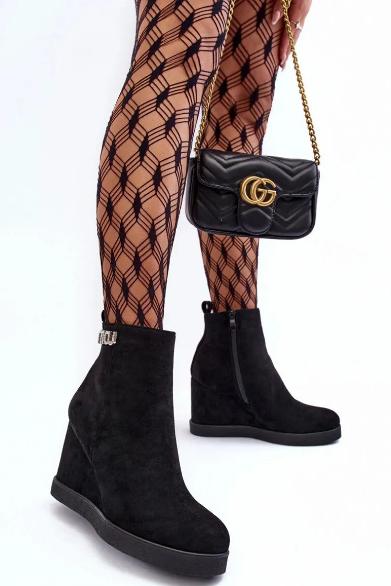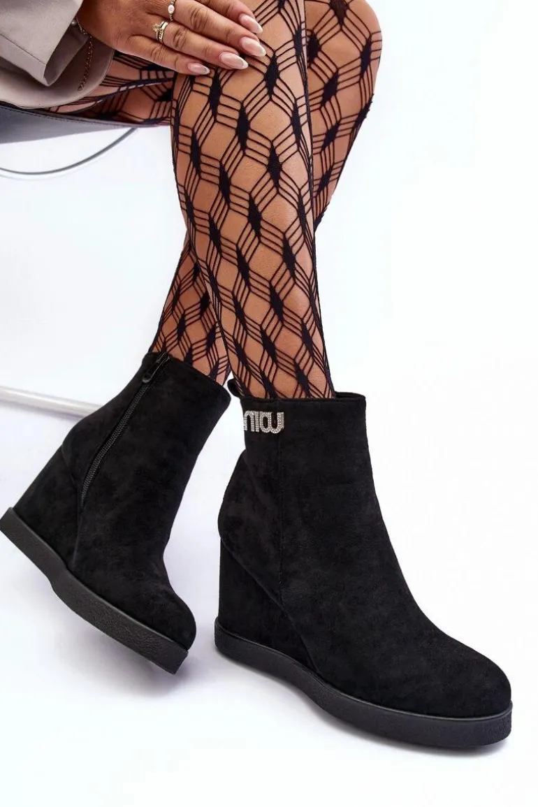 Botki z cholewką za kostkę zapinane na suwak po wewnętrznej stronie. Osadzone na koturnie oraz platformie. Wykonane z eko zamszu. Zapiętek usztywniony, noski zaokrąglone. Na górze cholewki mała ozdoba. Wnętrze ocieplone kocem obuwniczym. Przy wyborze rozmiaru prosimy sugerować się tabelą rozmiarów.