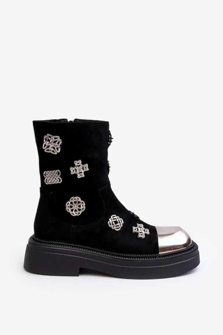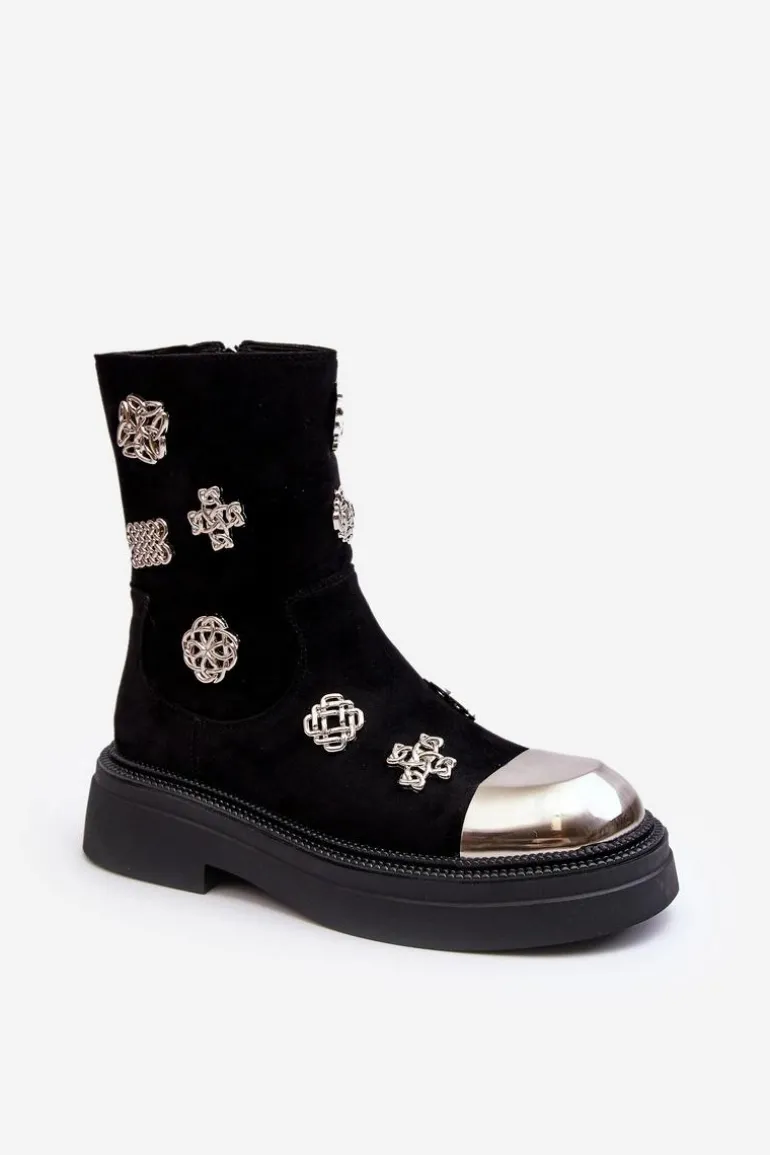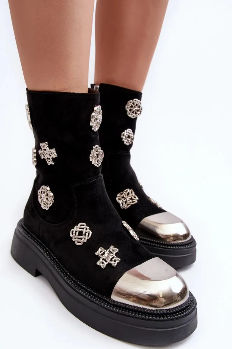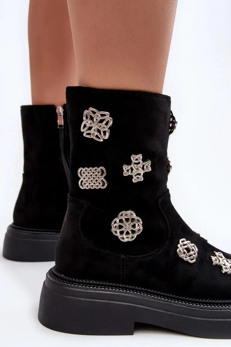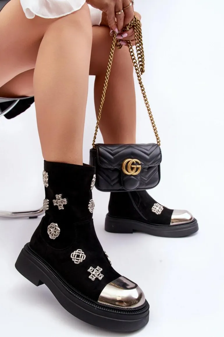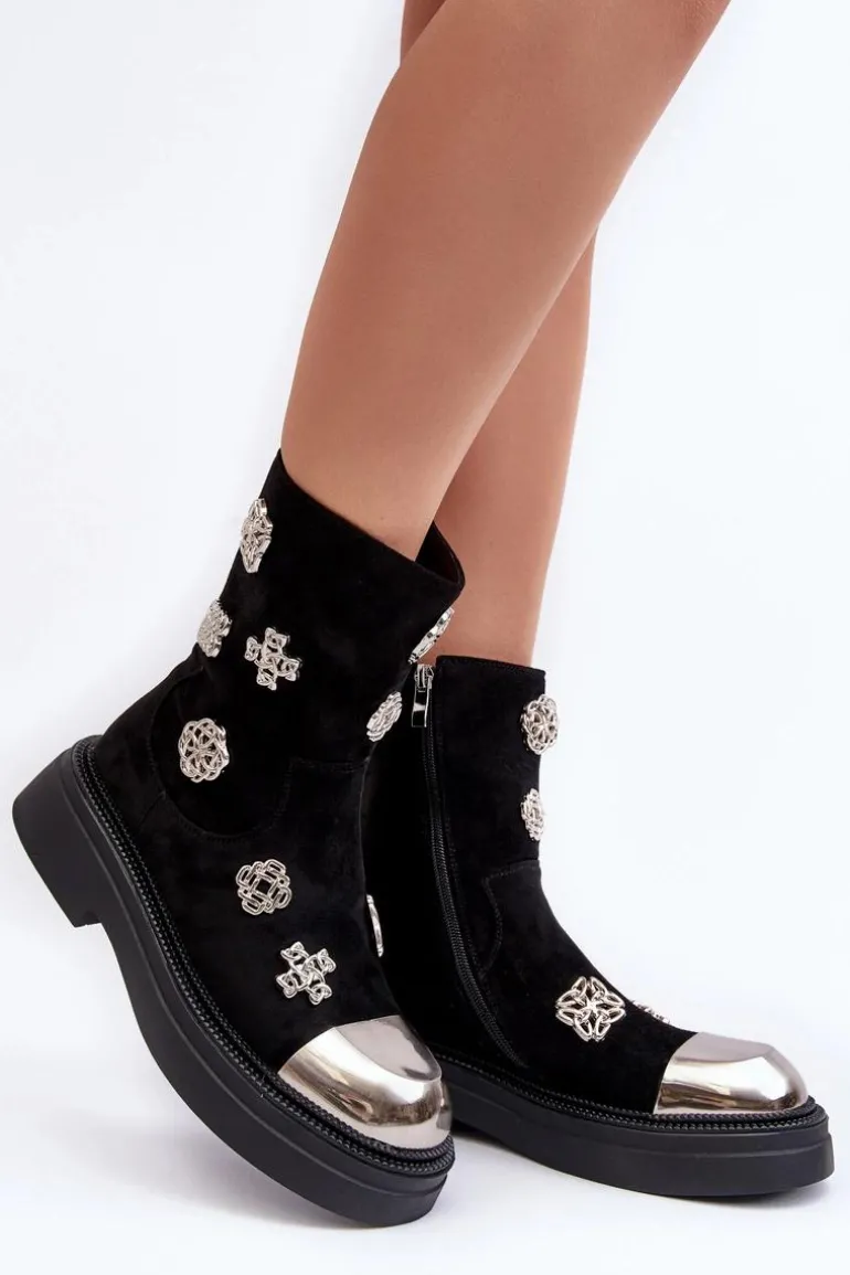 Botki damskie z ozdobami na cholewce. Wykonane z eko zamszu. Zapinane na suwak. Osadzone na płaskim obcasie i platformie. Środek ocieplony kocem obuwniczym. Dodatkowo zapiętek jest usztywniony. Ten modny model koniecznie powinien znaleźć się w Twojej szafie. Koniecznie sprawdź całą naszą ofertę botków! Przy wyborze rozmiaru prosimy sugerować się tabelą rozmiarów.