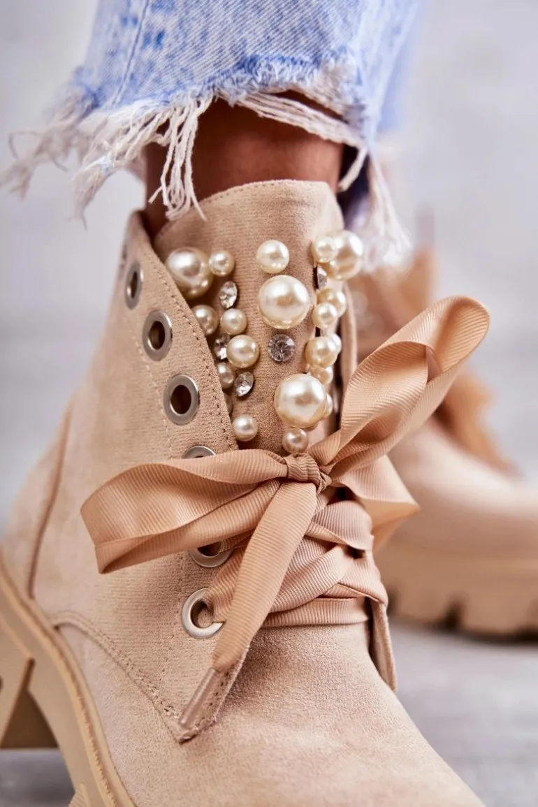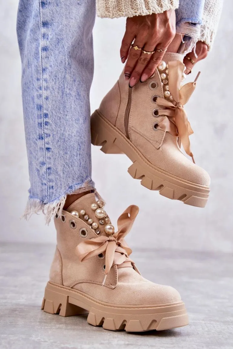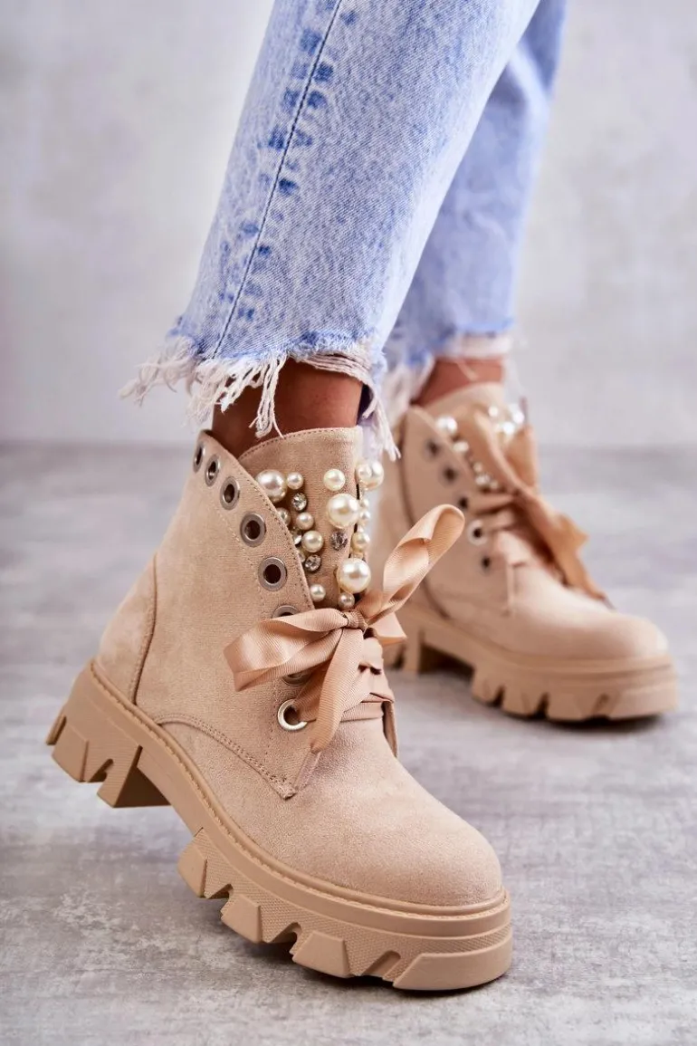 Wyjątkowe botki damskie wykonane z eko zamszu. Wnętrze ocieplone jest miłym w dotyku kocem obuwniczym. Model wyróżnia się krojem cholewki oraz elementami w postaci perełek i ćwieków. Ozdobna wstążka świetnie dopełnia całość. Zapinane także na suwak z boku cholewki. Osadzone na platformie i płaskim obcasie. Ten model musi być Twój! Nie czekaj dłużej aż zniknie! Przy wyborze rozmiaru prosimy sugerować się tabelą rozmiarów.