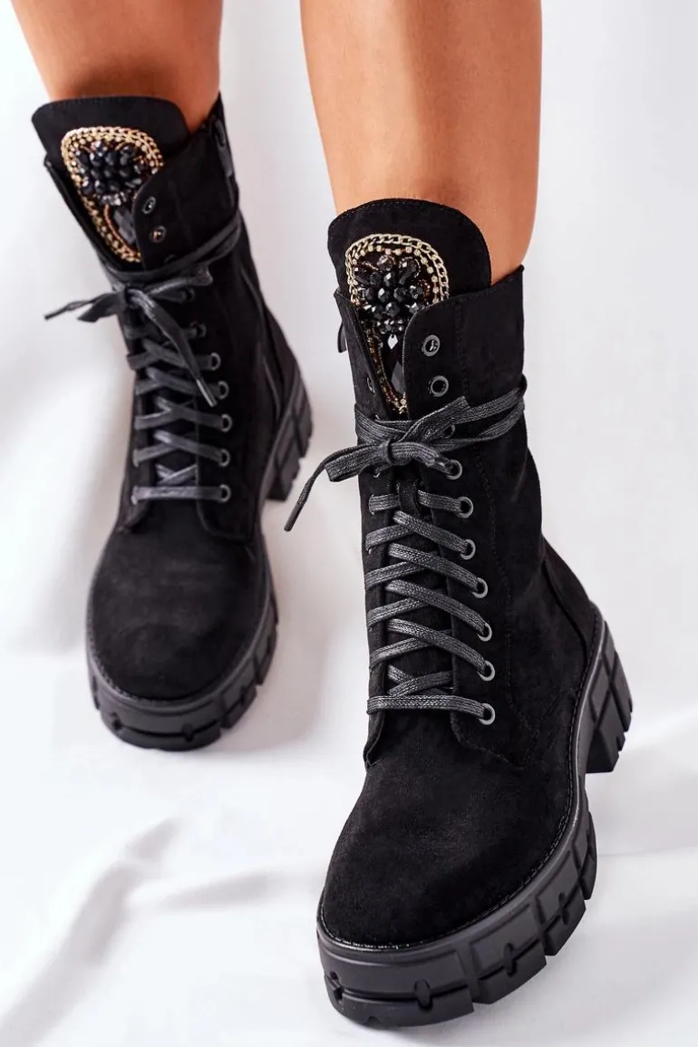 Wyjątkowe botki damskie wykonane z eko zamszu. Workery są ocieplone miłym w dotyku kocem obuwniczym. Przy wyborze rozmiaru prosimy sugerować się tabelą rozmiarów.