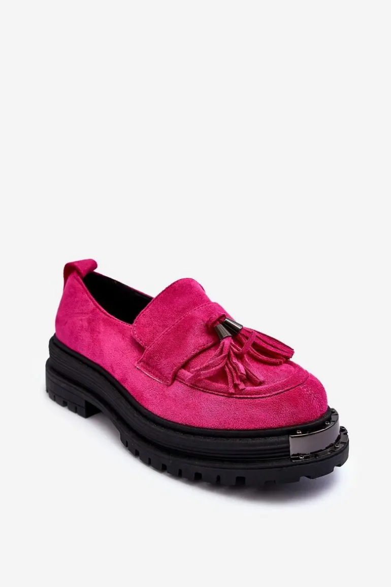 Damskie mokasyny to idealne obuwie na wiele okazji! Wykonane z eko zamszu. Osadzone na płaskim obcasie oraz platformie. Noski zaokrąglone. Przód ozdobiony paskiem z frędzlami. Miękka eko skórzana wkładka zapewni komfort podczas użytkowania. Dodatkowo zapiętek jest usztywniony. Ten model z pewnością przypadnie Ci do gustu! Przy wyborze rozmiaru prosimy sugerować się tabelą rozmiarów.