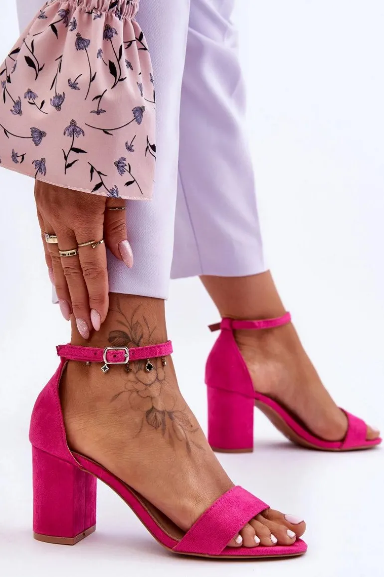 Klasyczne sandałki damskie osadzono na obcasie w postaci stabilnego słupka. Buty te zostały wykonane z eko zamszu. Nosek jest odkryty, zaokrąglony. Miękka wkładka z eko skóry zapewni komfort podczas użytkowania. Buty posiadają regulowany pasek zapinany na sprzączkę wokół kostki. Model ten wykorzystasz w wielu stylizacjach. Dodatkowo zapiętek został delikatnie usztywniony. Przy wyborze rozmiaru prosimy sugerować się tabelą rozmiarów.