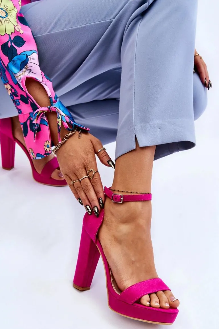 Sandałki osadzone zostały na platformie oraz wysokim obcasie w postaci cienkiego słupka. Wkładka została wykonana z eko skóry. Model zapinany wokół kostki na regulowany pasek ze sprzączką. Świetny model na wiele ważnych uroczystości. Idealne zarówno do sukienek, spódniczek, jak i spodni. Przy wyborze rozmiaru prosimy kierować tabelą rozmiarów.